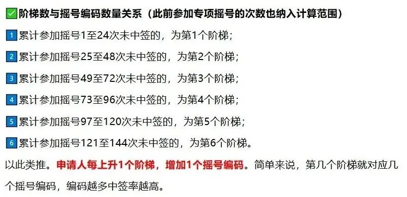 一、阶梯摇号按照《实施细则》第十二条第四项有关规定,按申请人累计参与普通小汽车摇号次数确定阶梯数,并根据阶梯数确定摇号编码数量。