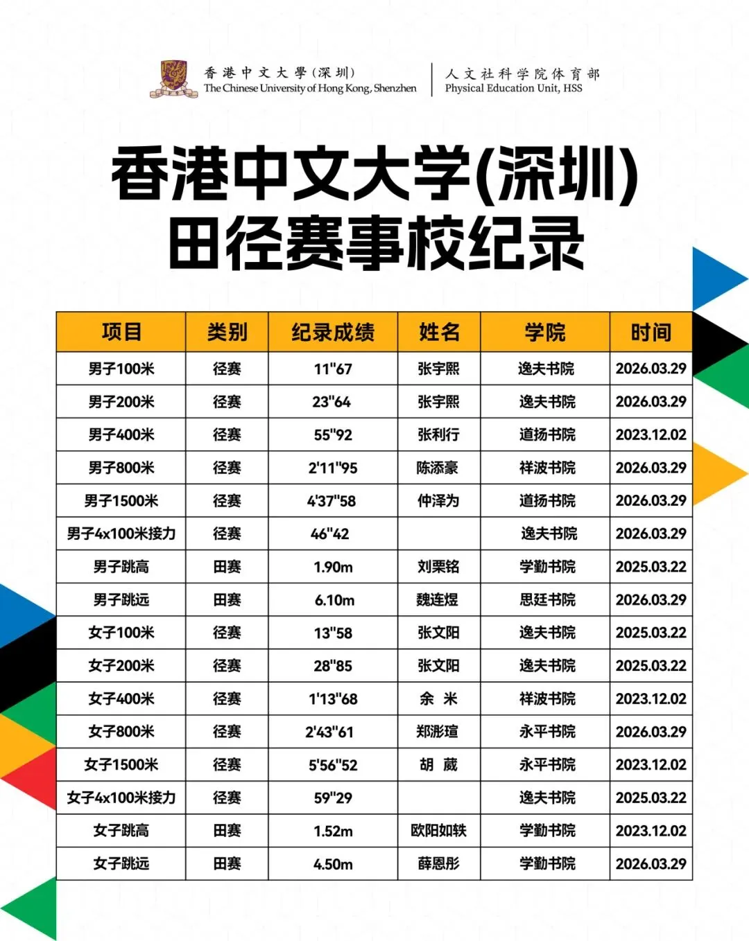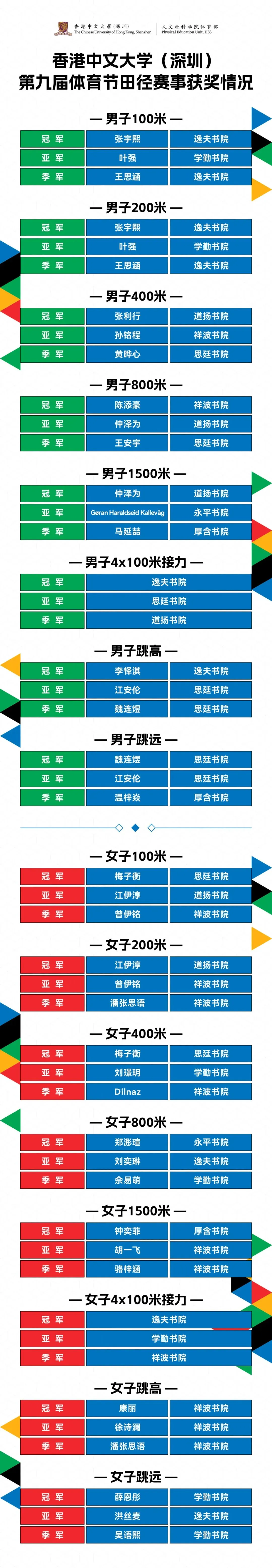 来到港中大(深圳)后,我很幸运遇到了专业的田径教练和很有责任心的带队老师,他们帮助我们规划训练安排、处理大小事务。田径队里还有一群一起向上突破、相互扶持的队友,大家让我的大学生活充满激情。感谢书院各个队员的参与付出和为我们加油助威的同学,以及来到现场看我比赛的、多年陪伴支持我训练的亲爱的妈妈。最后,希望大学运动氛围越来越好,有更多同学参与活动和比赛,一同展现学校的凝聚力和奋斗精神。”