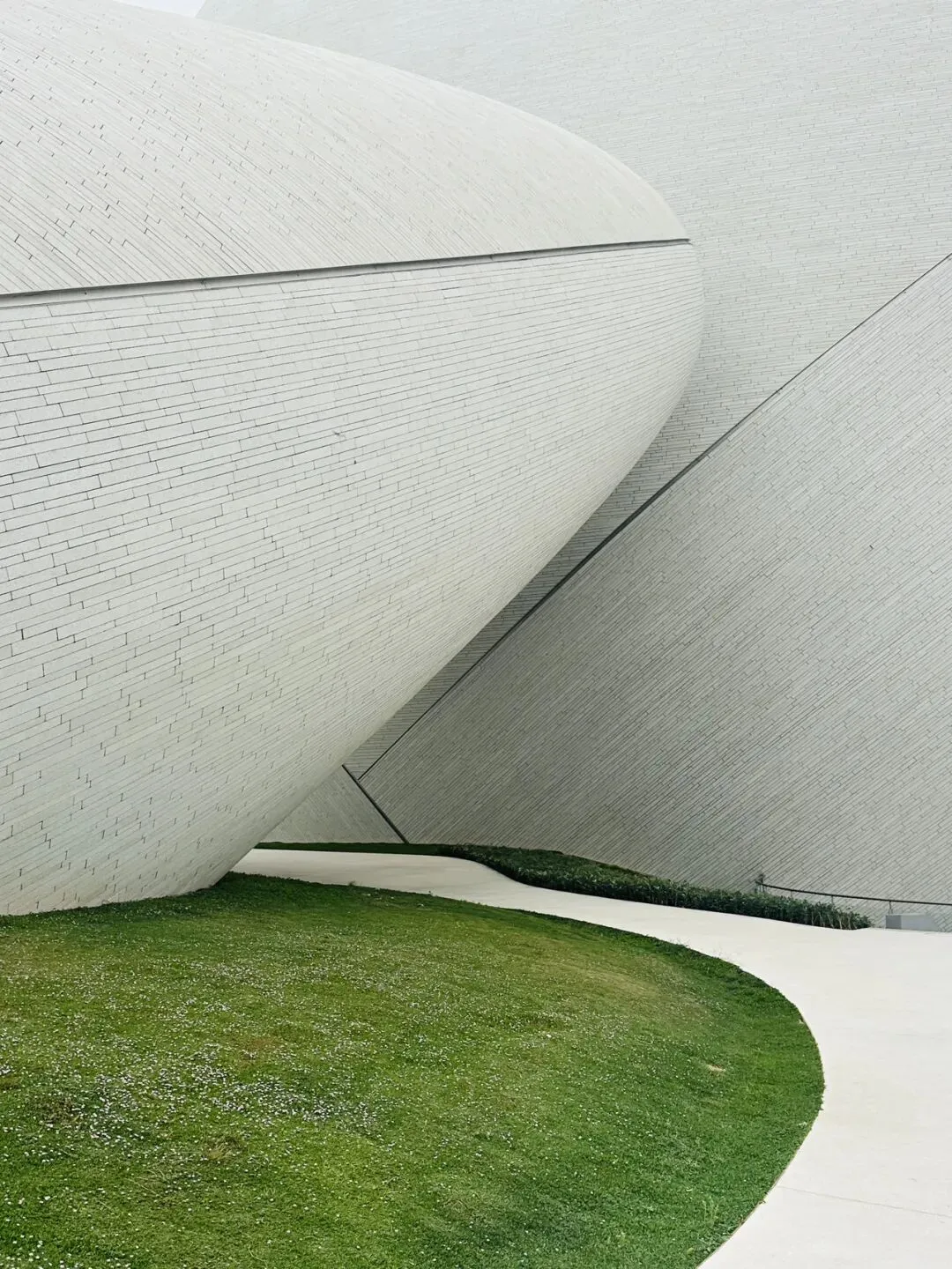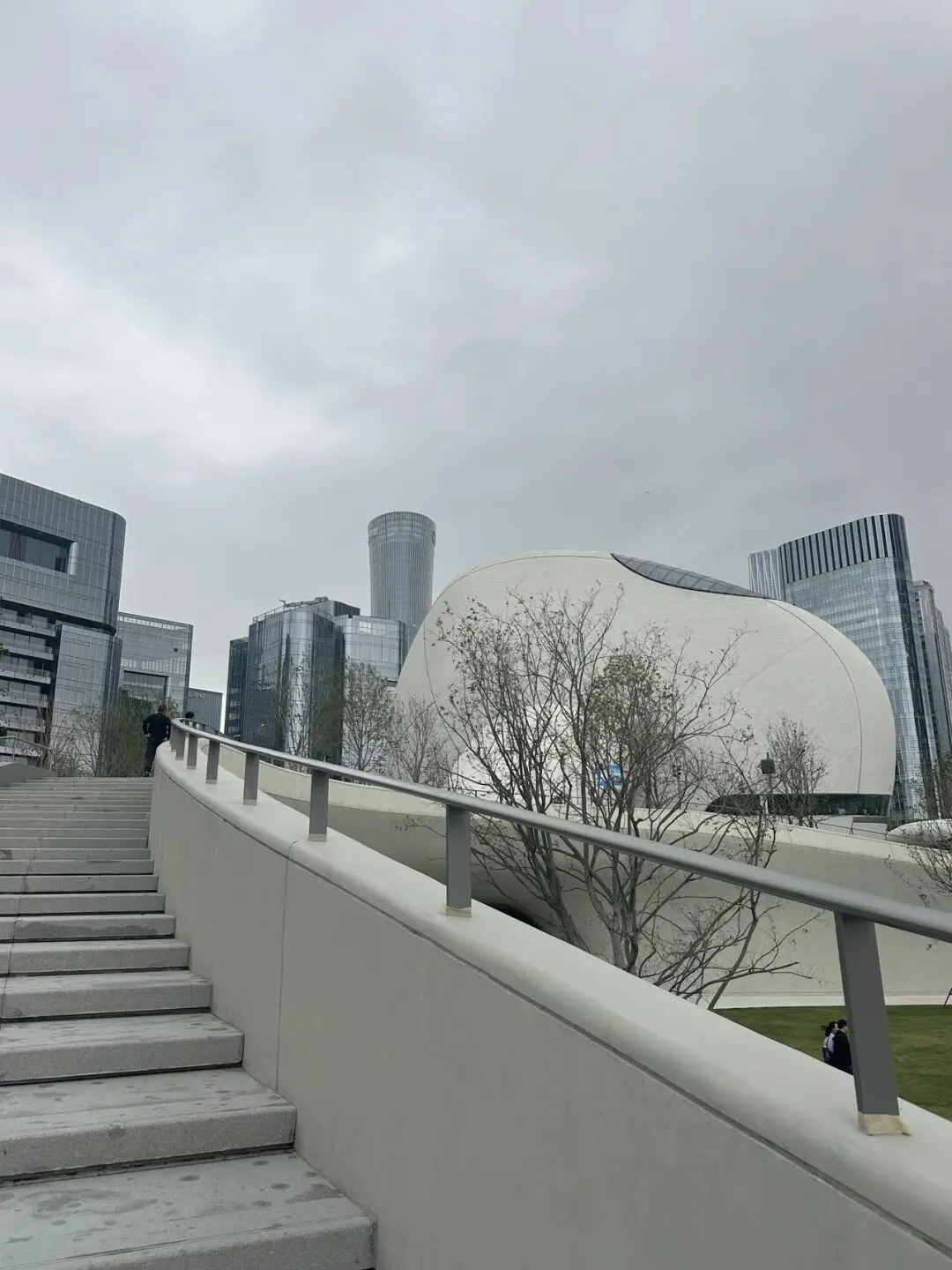 下桥就是文化广场,建筑像几块“海边原石”,被网友戏称“AirPods大楼”。不进展馆也能在外围拍大片。如果想进去,常设展《匠作中国》20元,周二到周日10:00-18:00开放(周一闭馆)。