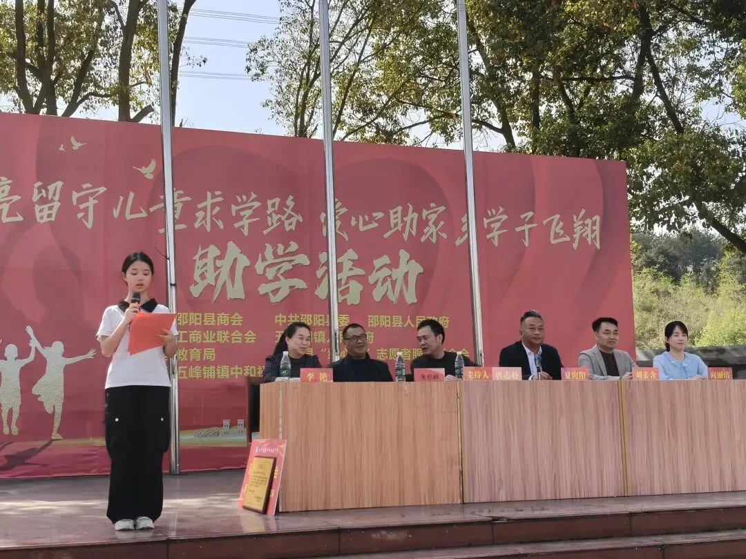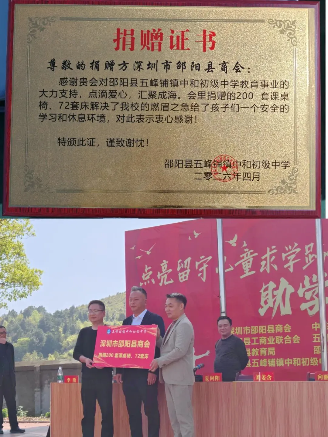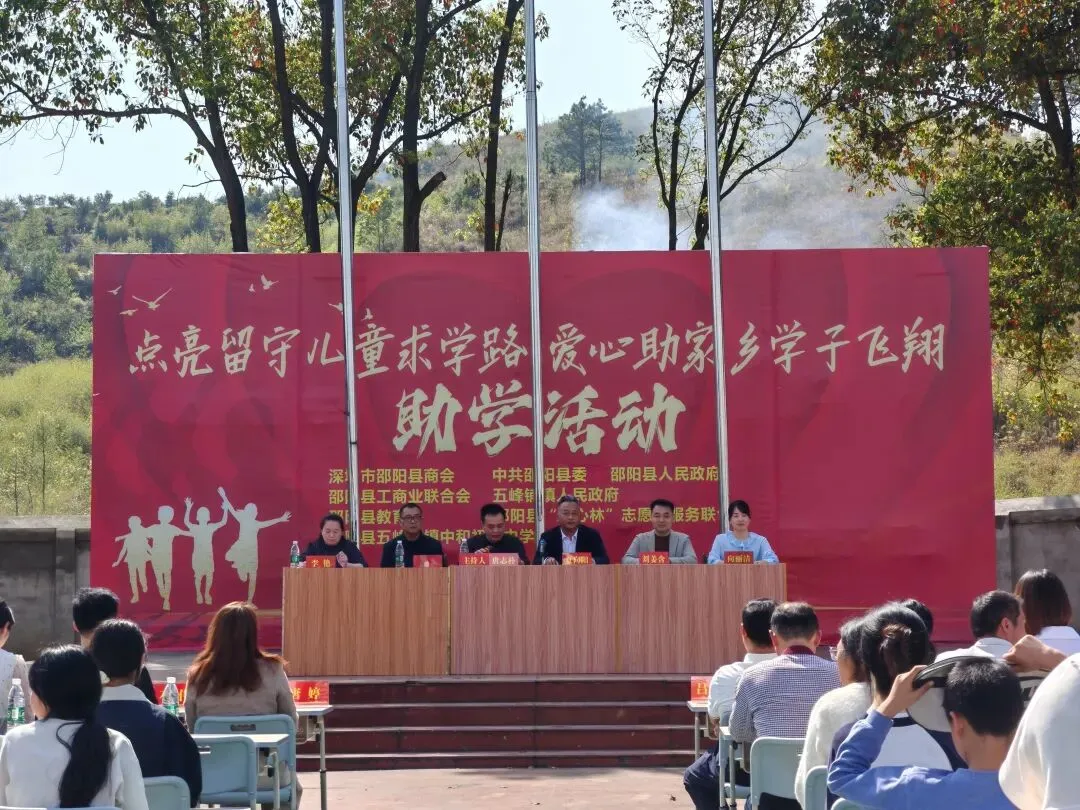 捐赠环节上,县教育局督学李艳致辞,对商会的慷慨捐赠表示感谢对孩子们寄予深切厚望;中共邵阳县委副书记、县委统战部部长夏向阳代表县委县政府高度肯定此次公益善举,感谢深圳市邵阳县商会的爱心担当,并向长期以来关心、支持我县教育事业的企业家和社会各界人士表示衷心感谢,勉励同学们心怀感恩、向阳成长;深圳市邵阳县商会会长刘姜含寄语学子珍惜时光、勤奋学习,将来回报社会、建设家乡。