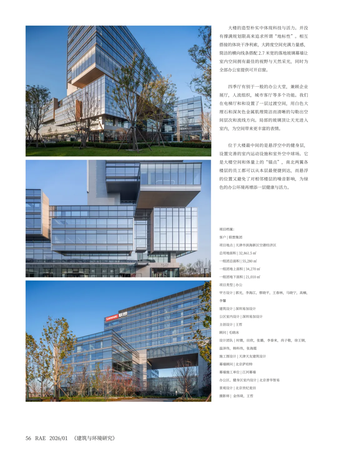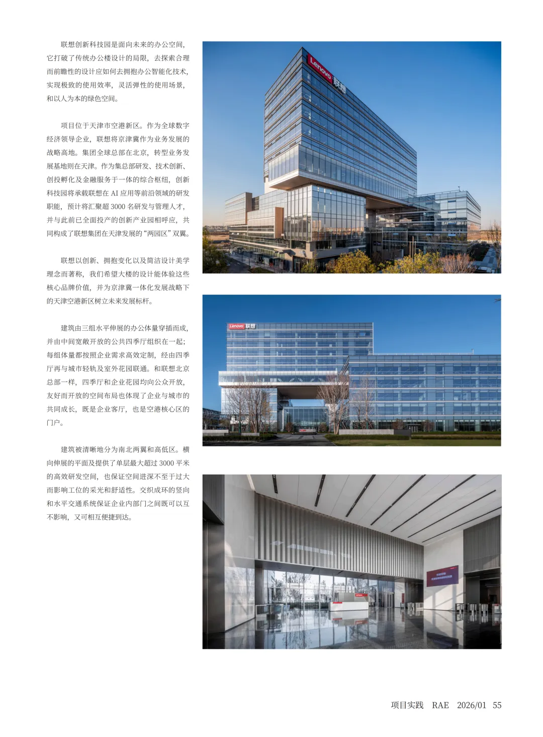 联想以创新、拥抱变化以及简洁设计美学理念而著称,我们希望大楼的设计能体验这些核心品牌价值,并为京津冀一体化发展战略下的天津空港新区树立未来发展标杆。