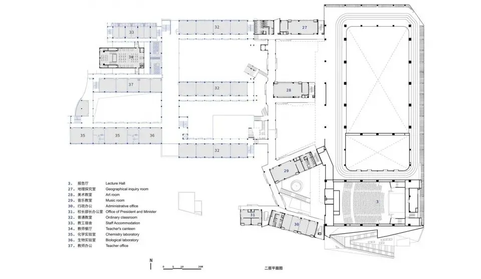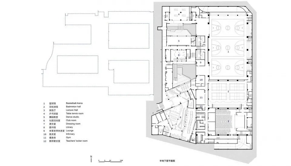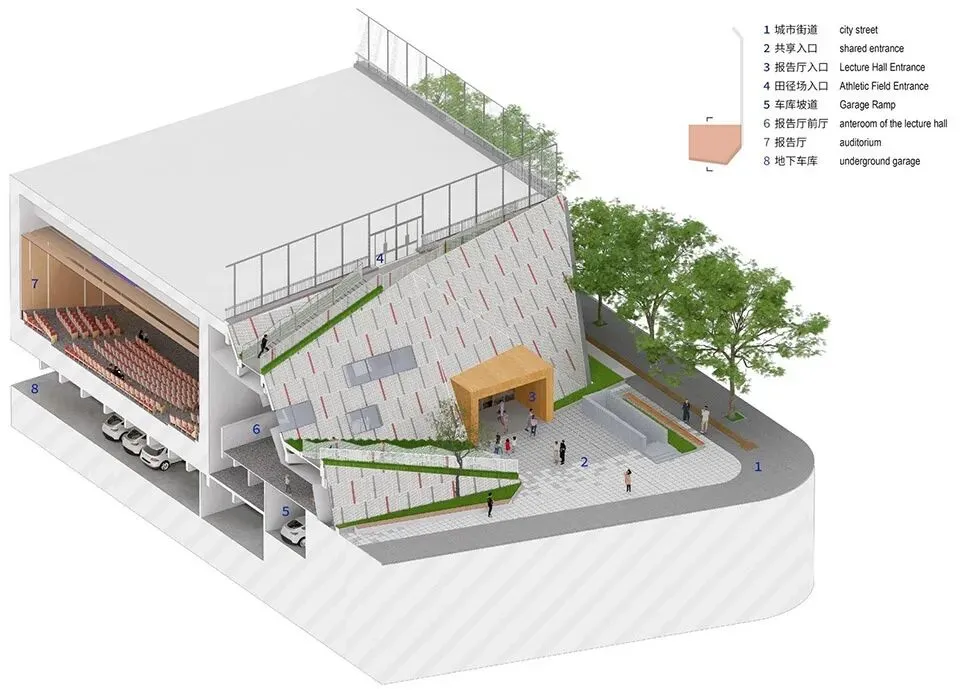 在红岭石厦校区的改造中,设计将操场抬升至7.2米的空中,其下方则植入一系列公共功能空间,包括700人报告厅、半室内篮球馆、羽毛球场、空中跑道等体育设施,以分时共享的方式向社区居民开放。