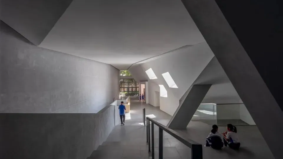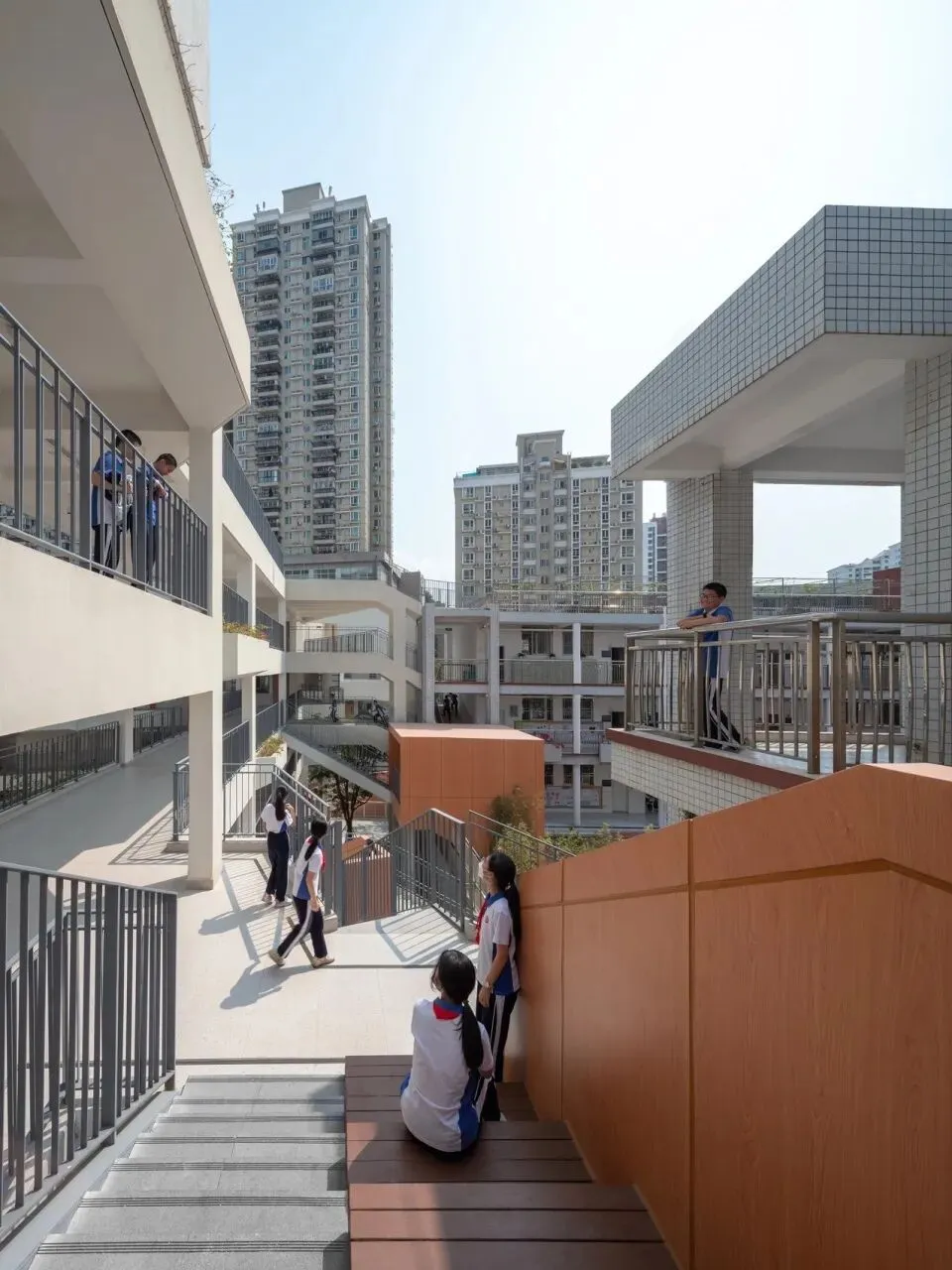 在新旧交接处,一组新置入的白色室外楼梯,在不同高度上将新旧教学楼相互连通。新建筑三楼的走廊也被适当扩宽,并与空中操场衔接,让学生能够高效抵达各处。新旧建筑之间通过室外走廊相连。这些兼具交通与社交功能的廊道,以及多处放大的“盒子”空间,成为学生日常驻足、交流的场所。