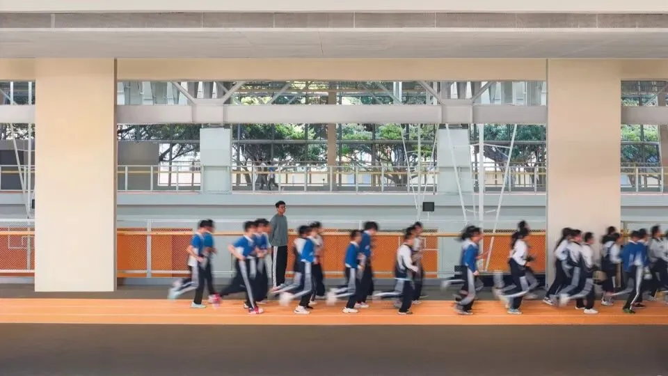 城市生活也是学生学习体验的一部分。通透的立面,让在空中跑道运动的学生,能近距离观察街道的日常,体验一种生动的、关于社会生活的“非正式课程”。学生矫健的身影与欢笑声,也不时地从运动场弥漫到街道,吸引路人驻足观看。半层高差的跑道设计,连同独特而治愈的声音景观,让这种互动保持一种微妙而舒适的距离。