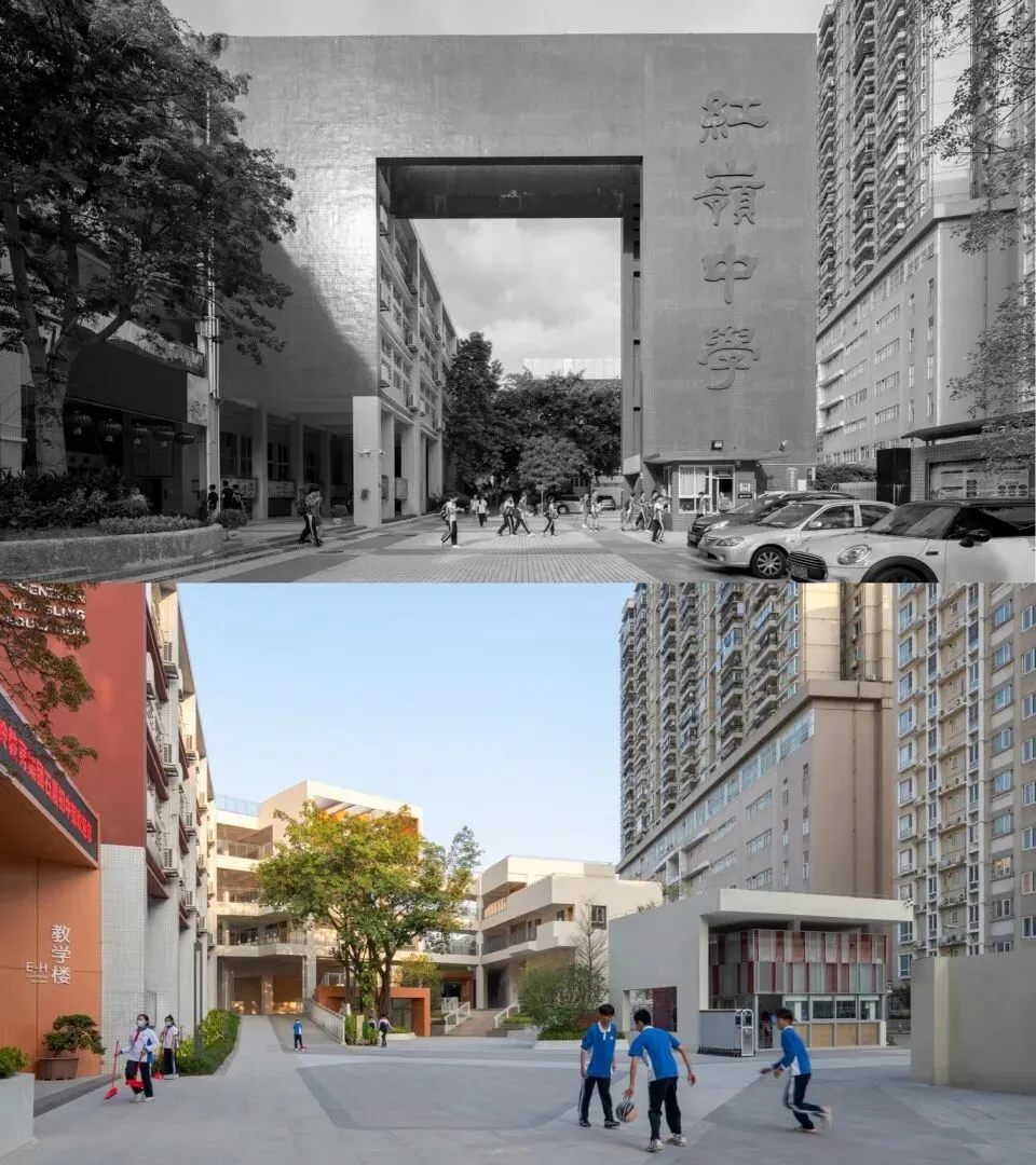 在“8+1”新校园行动计划第一季的九所学校里,红岭石厦是唯一一所被实施的改扩建项目。我们在保证校园西侧教学楼正常使用的前提下,完成了整个校园的更新与扩建。这也极大地提升了设计与施工的复杂性与挑战性。它的设计经验,也为后来燎原之火的深圳南山“百校焕新”行动埋下了伏笔。