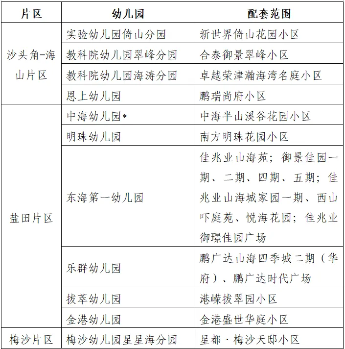 大鹏实验幼儿园、家天下幼儿园、半山海幼儿园、亚迪新村幼儿园、坝光新村幼儿园、东岸幼儿园、云山栖幼儿园、鹏湾幼儿园、鹏曦幼儿园、东湾幼儿园、铂樾幼儿园;
