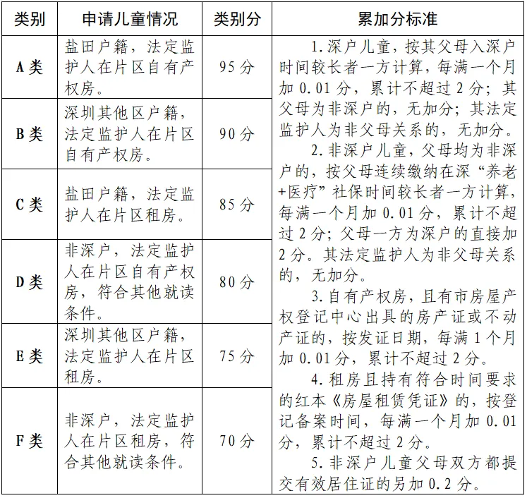 1.类别分:按申请人户籍和监护人住房情况,划分为A、B、C、D、E、F六个学位申请类别,分类办法及对应分值详见《盐田区幼儿园学位申请人入园积分表》(以下简称《积分表》)。
