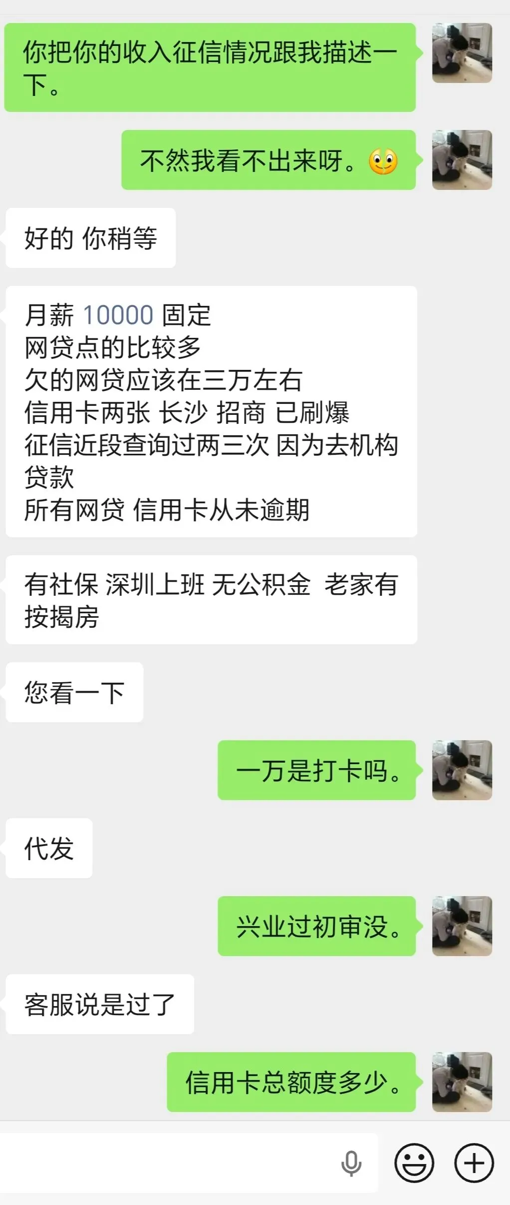 后续就是我接手了:我接手事情就变得很简单了,资料(征信,收入,社保,公积金等)发我评估,费用3-5%到账后收取没有任何其他费用。