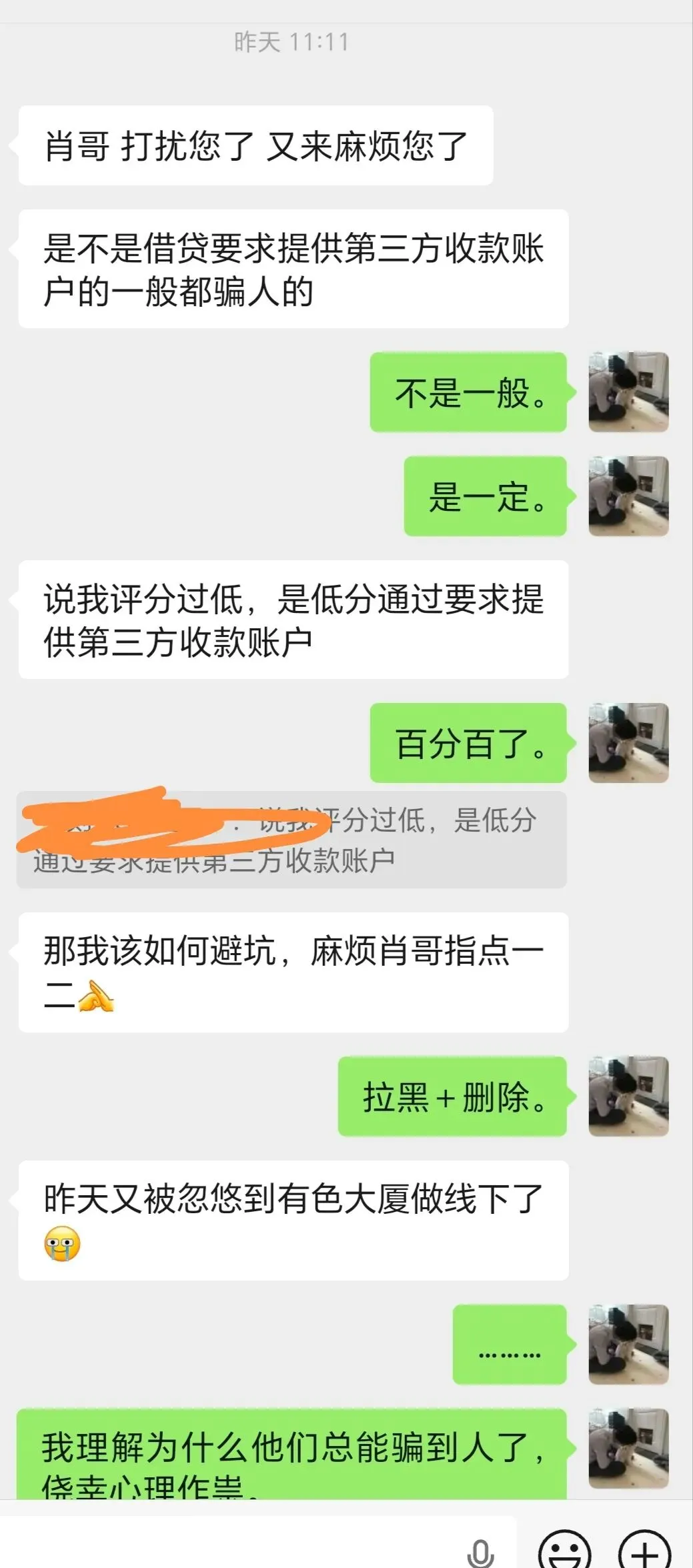 A看了我公众号觉得我很靠谱,担心那边有诈想通过我给他做,我的回答是:电销中介开发一个客户也不容易,我直接给你做属于是抢别人劳动成果,你可以去他们公司聊聊,如果没有什么套路+合理费用的情况下直接在那边做就行,我不做趁人之危的事。