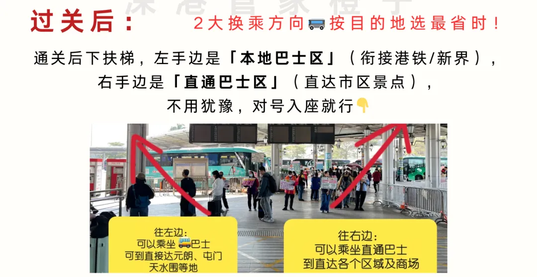 通关后下扶梯,左手边是「本地巴士区」(衔接港铁/新界),右手边是「直通巴士区」(直达市区景点),若想全程轻松不搬行李,直接选「跨境包车」,3种方案对号入座👇