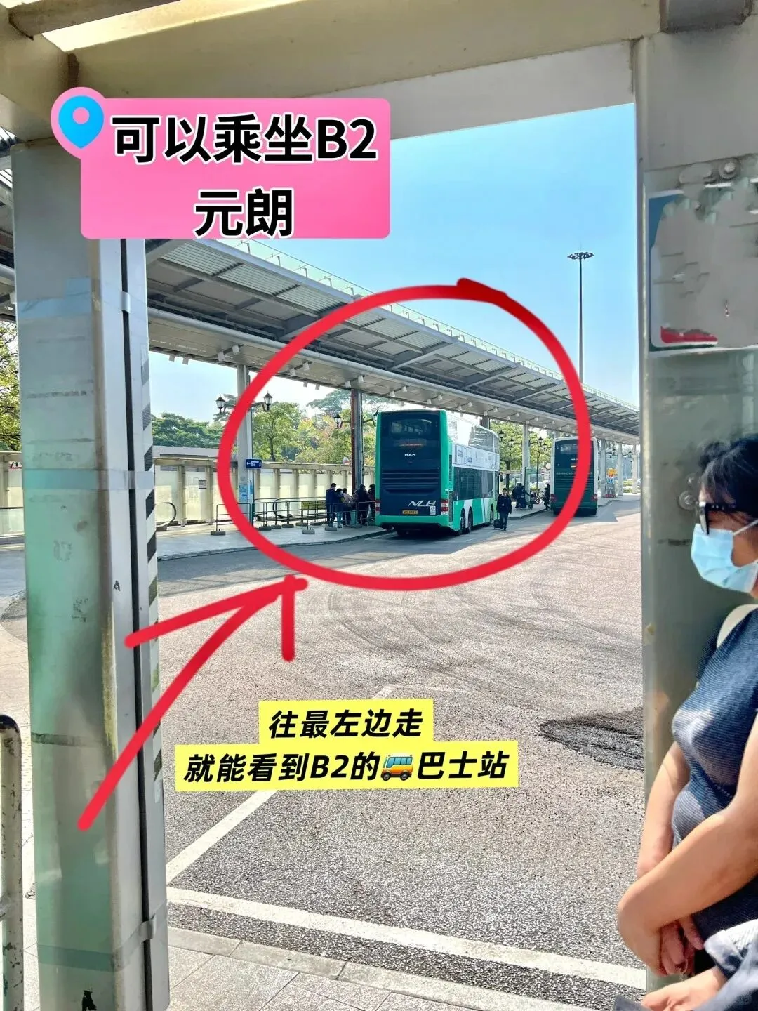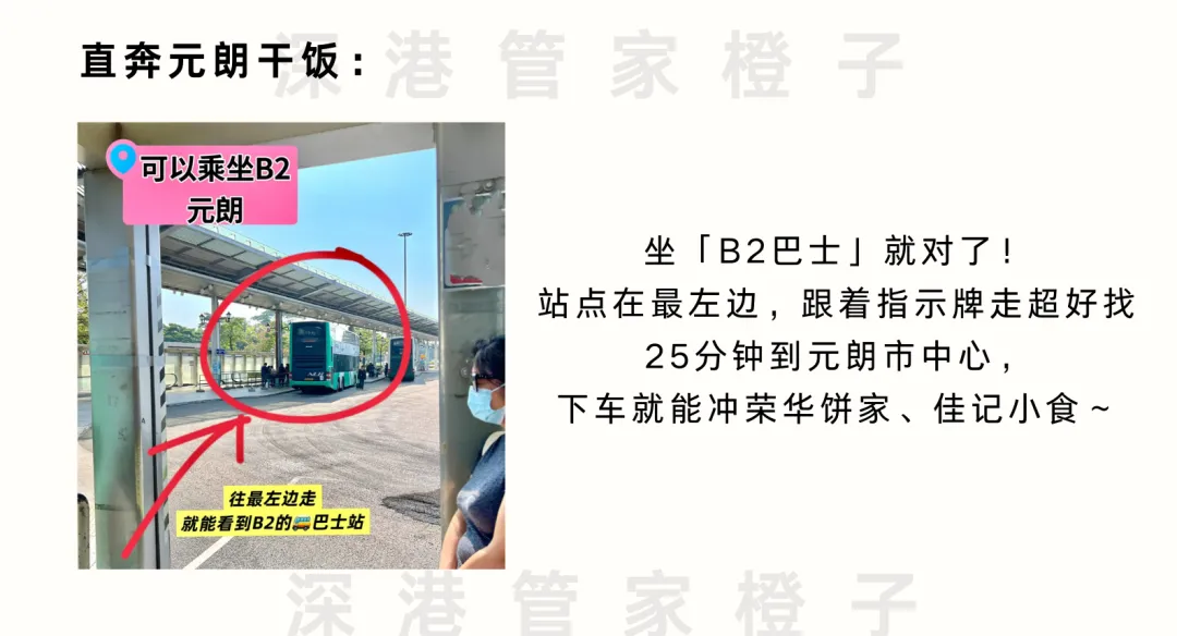 直奔元朗干饭:坐「B2巴士」就对了!站点在最左边,跟着指示牌走超好找,25分钟到元朗市中心,下车就能冲荣华饼家、佳记小食~