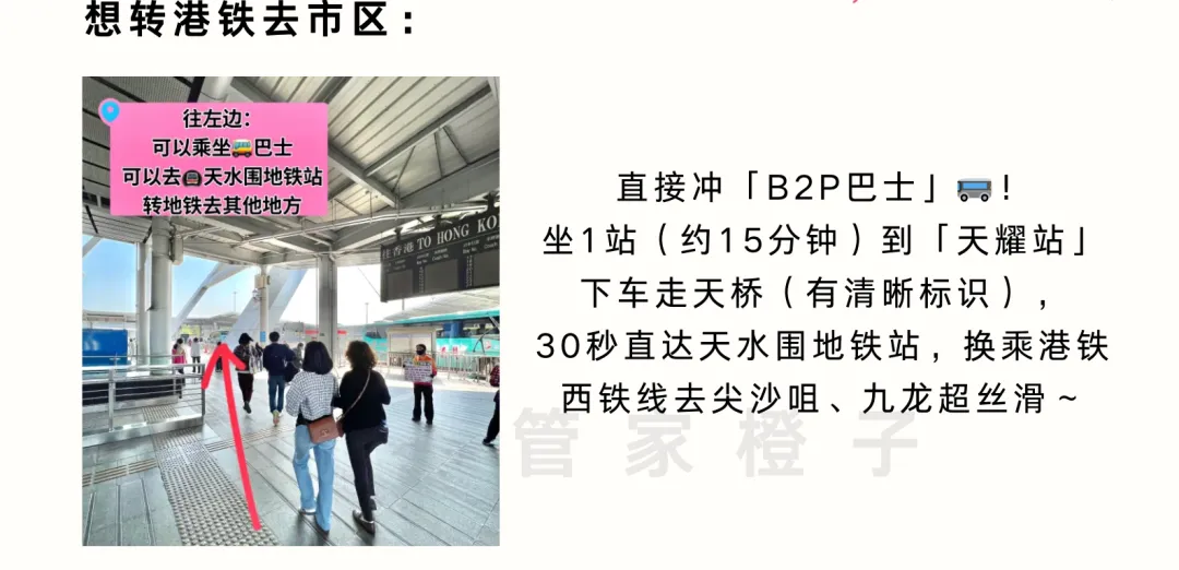 想转港铁去市区:直接冲「B2P巴士」🚌!坐1站(约15分钟)到「天耀站」,下车走天桥(有清晰标识),30秒直达天水围地铁站,换乘港铁西铁线去尖沙咀、九龙超丝滑~