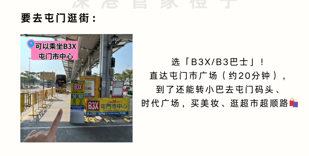 要去屯门逛街:选「B3X/B3巴士」!直达屯门市广场(约20分钟),到了还能转小巴去屯门码头、时代广场,买美妆、逛超市超顺路🛍️