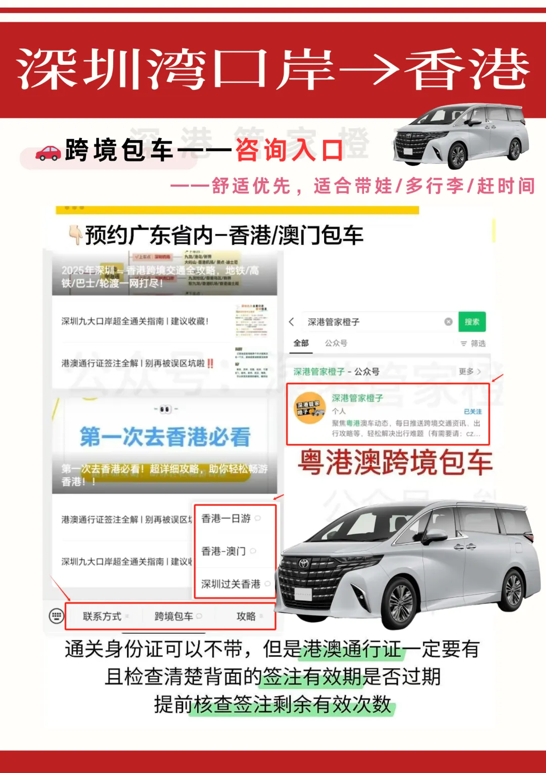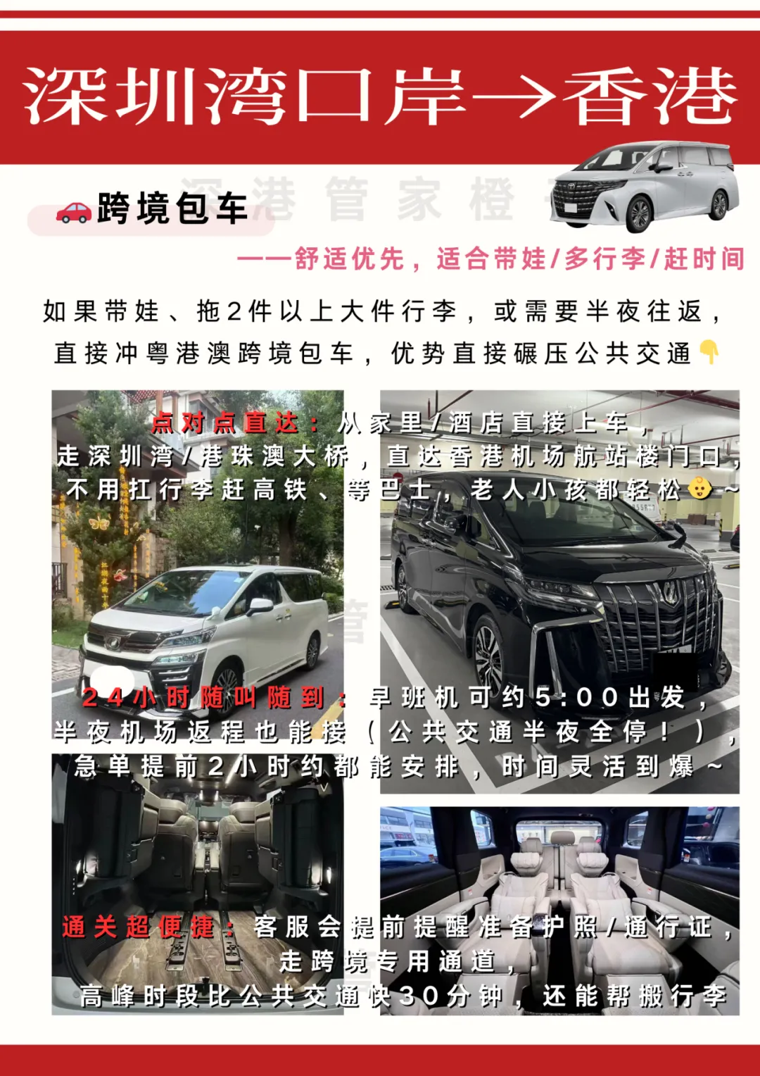 如果带娃、拖2件以上大件行李,或想省去搬运行李、找车站的麻烦,直接选深圳湾口岸直达香港市区/景点的跨境包车,优势超明显👇