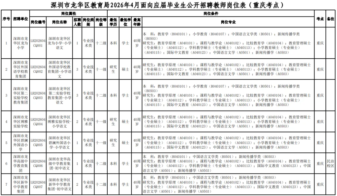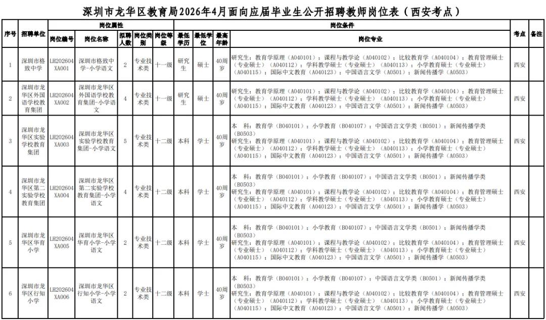 深圳市龙华区区属公办中小学是深圳市龙华区教育局直属事业单位,涵盖义务教育、高中教育,2026年4月拟面向2026届毕业生公开招聘在编教师188名,具体岗位见《深圳市龙华区教育局区属公办中小学2026年4月公开招聘教师岗位表(西安、重庆)》(附件1,以下简称《招聘岗位表》)。现就有关事项公告如下: