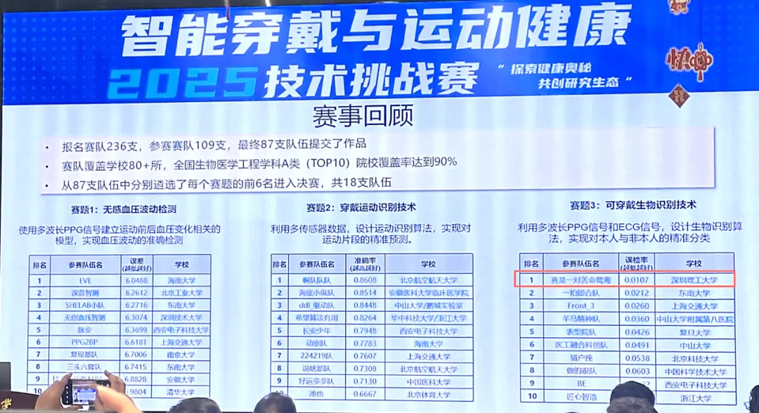 预赛中,深圳理工大学参赛队以绝对优势取得第一。在全国总决赛中,该队伍与上海交通大学、浙江大学、复旦大学、东南大学、中山大学等高校同台竞技,最终拔得头筹,斩获可穿戴生物识别技术赛题的一等奖。