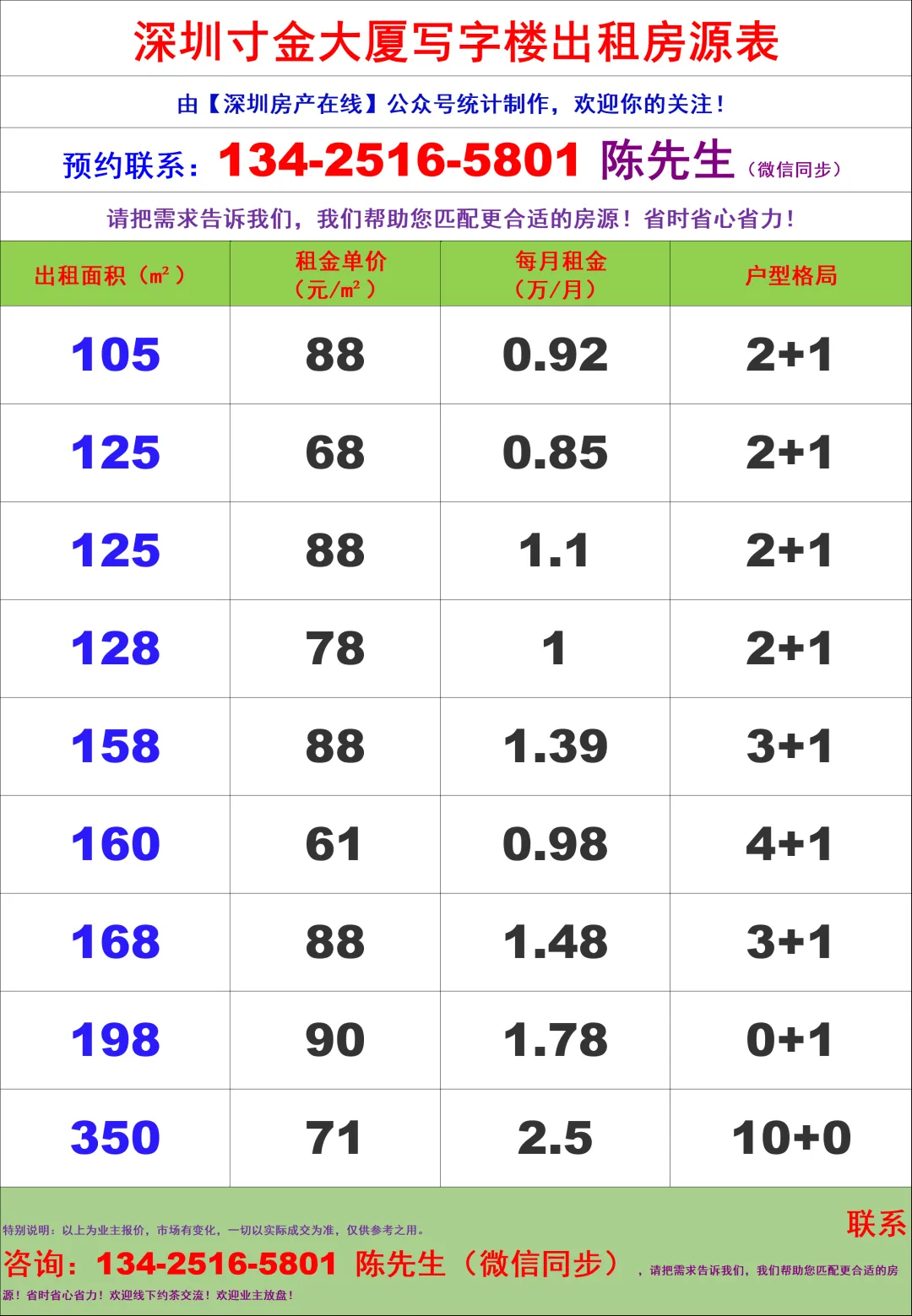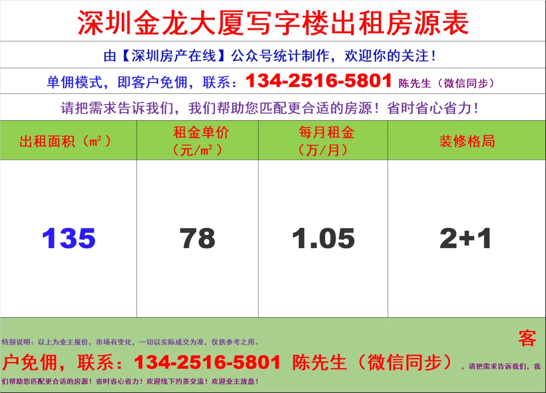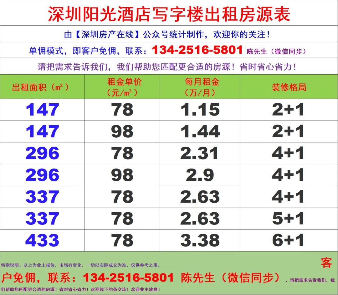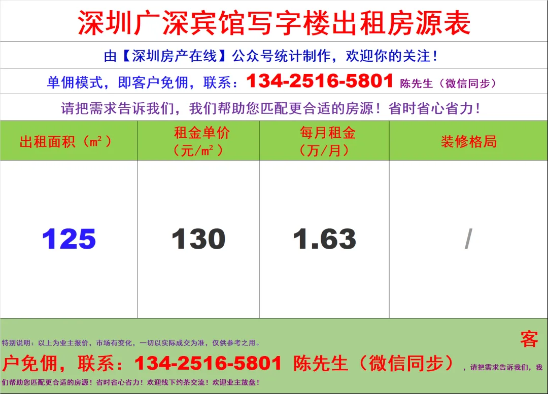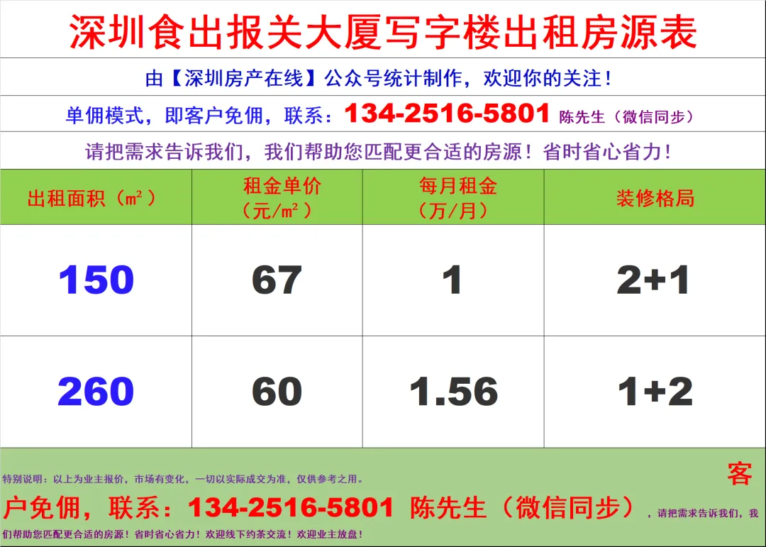 【深圳房产在线】陈经理写字楼租售团队:134-2516-5801 (微信同步)