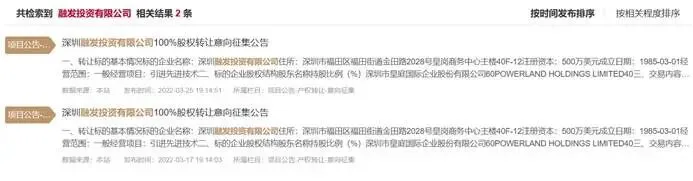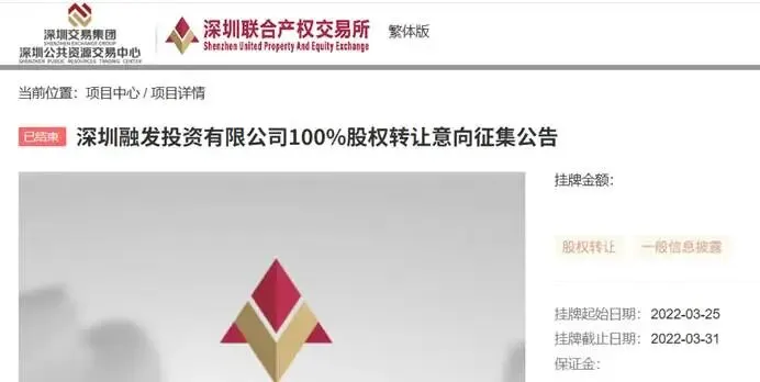【2022年3月18日首次】:转让参考价74.93亿元→无投资人报名;公告:《深圳融发投资有限公司100%股权转让意向征集公告》