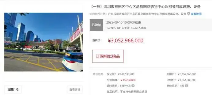 【2025-9-9至09-10京东拍卖】:皇庭广场及附属设施设备,评估价57.50亿元(2024年底),起拍价:30.53亿元(约53折);流拍(仅1人报名,未出价)。