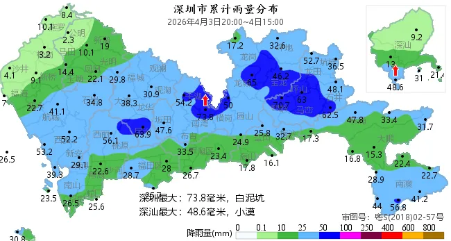 截至4日15时深圳全市累计雨量分布图