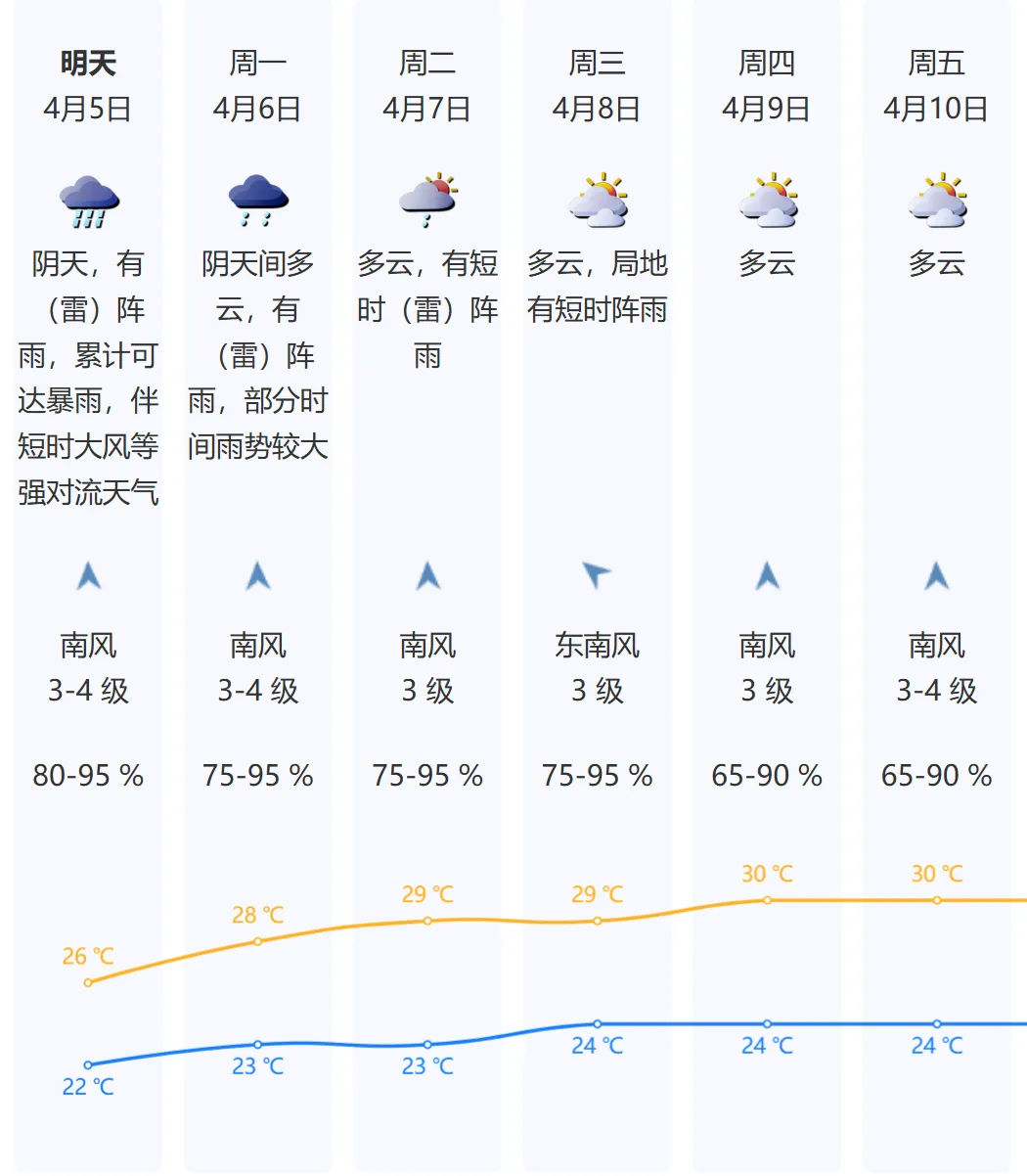 4月5日:阴天,阵雨频密,累计雨量可达暴雨,雨时伴有雷电、8级或以上短时大风等强对流天气,气温22~26℃;