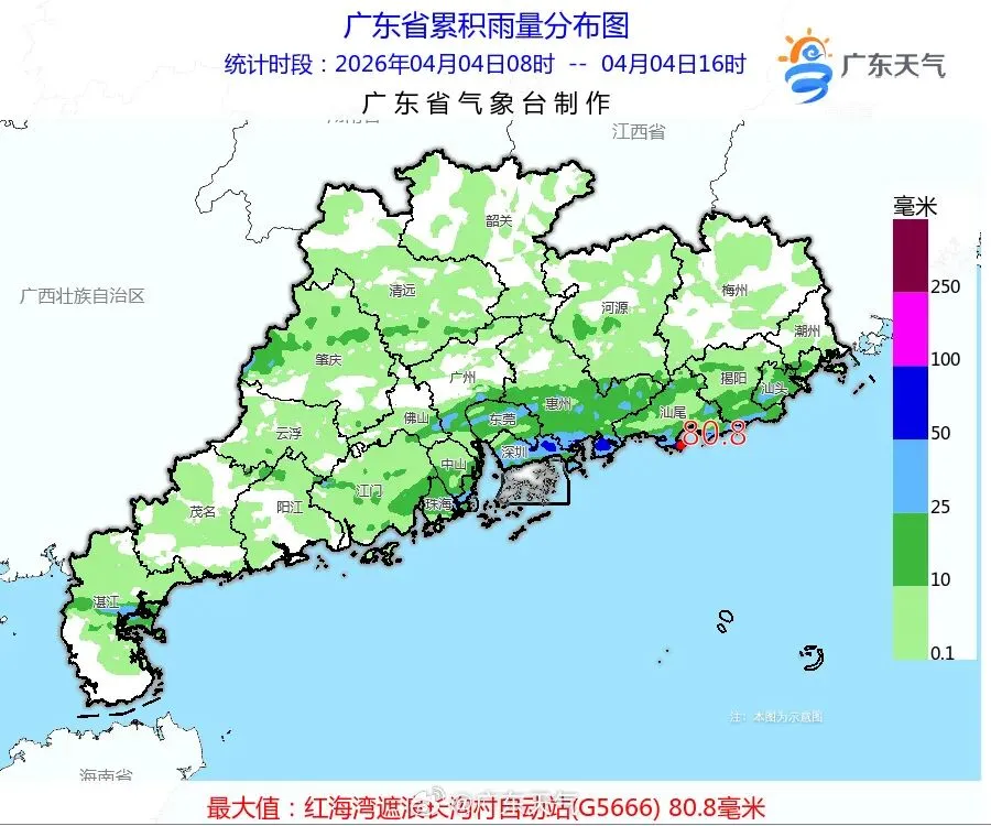 广东今天(4月4日)白天的雨都下哪了?据“广东天气”消息,4月4日8时到4月4日16时,全省平均雨量6.0毫米,超过25毫米镇街占全省总镇街数的12.2%,有35个镇街录得超过50毫米的暴雨,有166个镇街录得25毫米~50毫米的大雨。