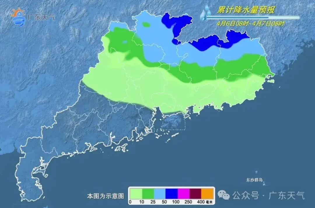 预计,4月5日-6日,粤北、粤东和珠三角市县有大雨到暴雨局部大暴雨,部分市县伴有8~10级短时大风、短时强降水和局地小冰雹;7日,广东全省大部降水明显减弱。