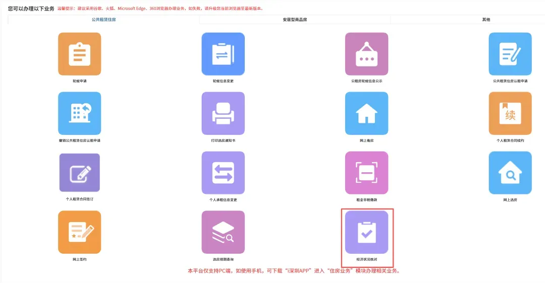 如果是老政策还未住上公租房的家庭,想转新政来做经济核对就选择“收入财产核对(在册)”,“收入财产核对(续约)”的意思是新政家庭重新再做经济核对,“收入财产核对(租金减免)”是已经住上公租房的老政家庭,续租的时候去经济核对,然后续租的时候按新政走;