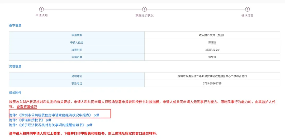 所有信息填写完毕提交上去之后,会进入到确认信息的界面,把页面中的 《深圳市公共租赁住房申请家庭经济状况申报表》和《承诺和授权书》这两份文件打印,带去住建局对应窗口提交;