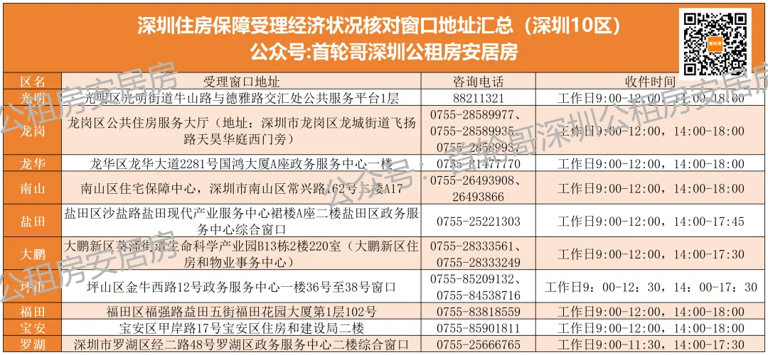 经济核对是分区的,主申请人户籍是哪个区就去对应区住建局的窗口提交经济核对的材料,深圳10个区经济核对窗口地址、咨询电话、收件时间如下图所示;