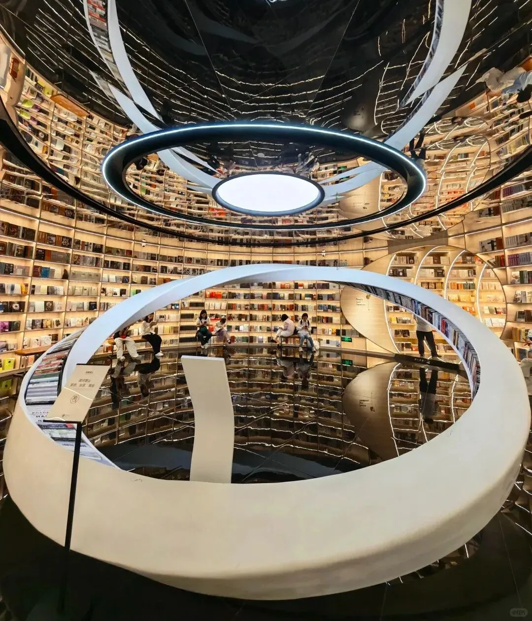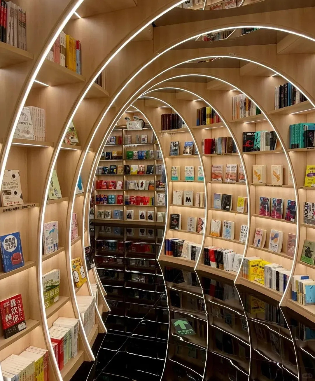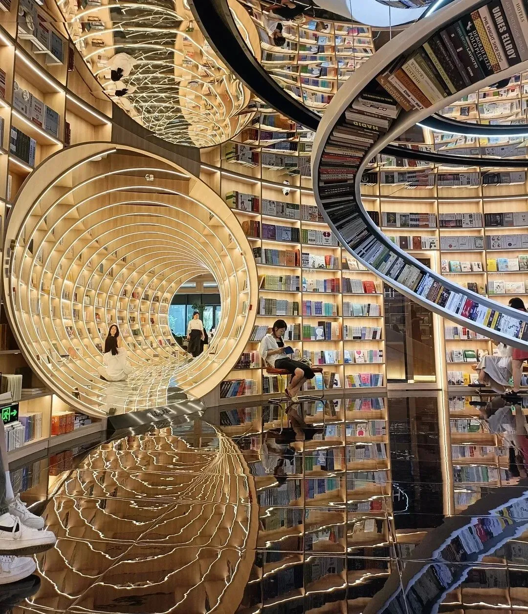 先跟大家说个重点,这家书店最火的就是那条长得看不到头的书廊。一圈圈的书架叠在一起,再加上天花板和地面的镜子,人站在中间,到处都是书的影子。