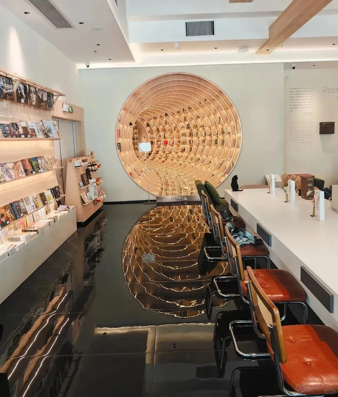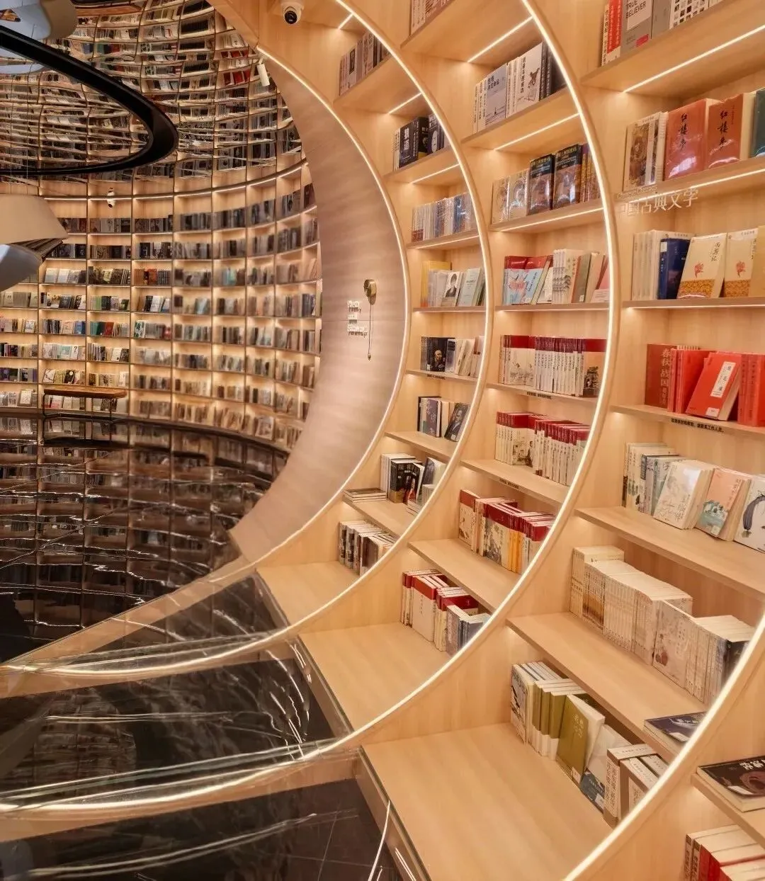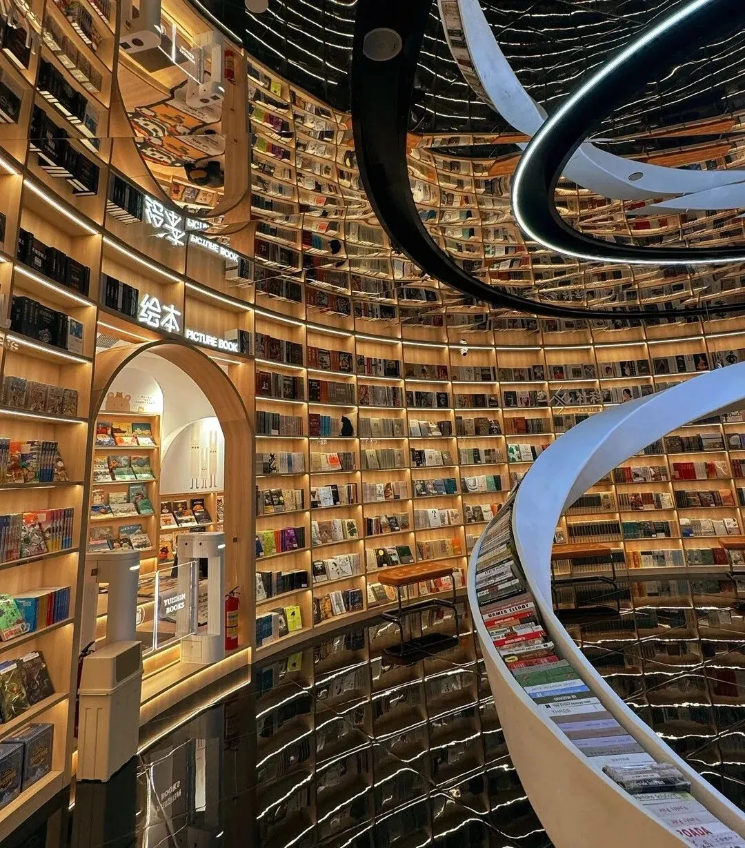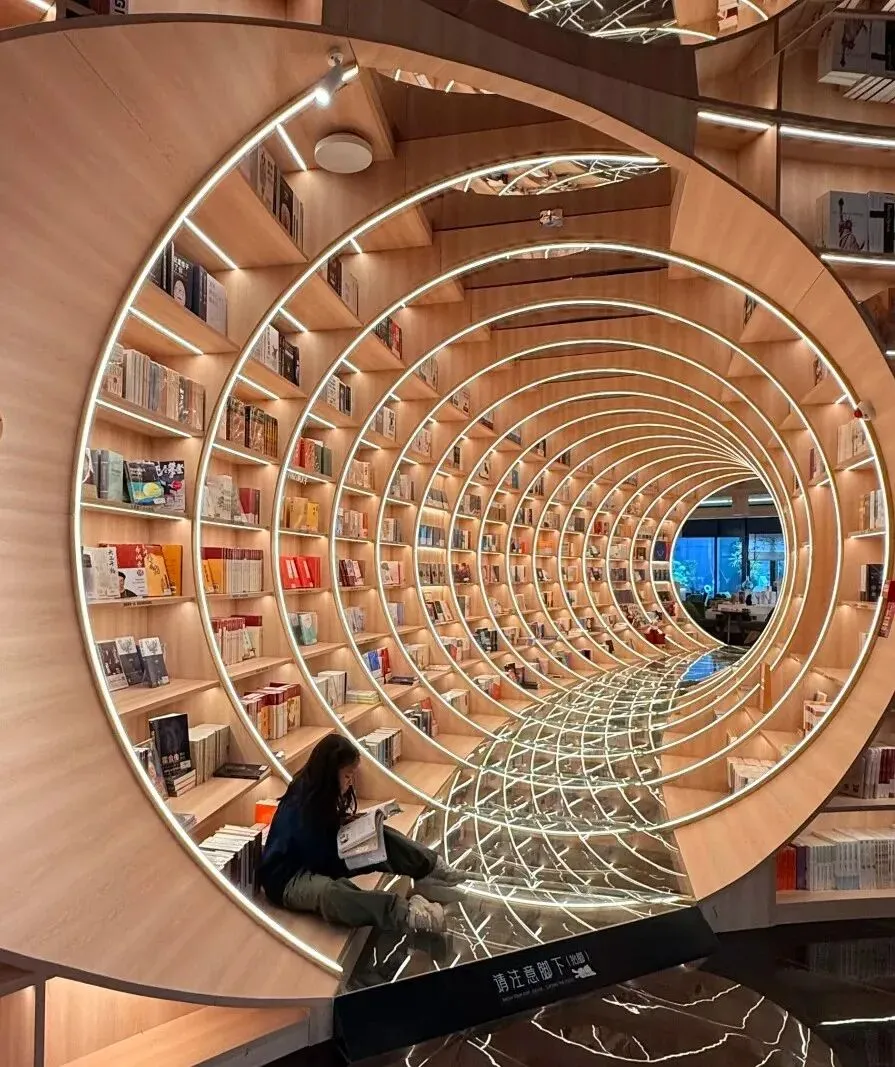 先跟大家说个重点,这家书店最火的就是那条长得看不到头的书廊。一圈圈的书架叠在一起,再加上天花板和地面的镜子,人站在中间,到处都是书的影子。