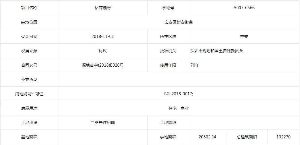 项目原属于宝城34-2片区城市更新,该旧改于2015年被纳入城市更新单元第三批计划,原拆除用地范围4万㎡,后宝城34-2片区旧改分为为东、西片区分别实施。2018年10月,招商蛇口以20119.871万获取了A007-0566宗地的使用权,土地用途为中低价位、中小套型普通商品住房用地,原定案名招商黄金台,后改为招商臻府。项目共计5栋超高层住宅(3栋为保障房),以及9班幼儿园建面2400㎡。占地2.06万㎡,总建面10.67万㎡,建筑高度156.4米,楼层层数地上43层,地下3层。停车位共1182个(地下1180,地上2个),车位比1:1.3,车位充足,商业面积约4000㎡。项目绿化覆盖率40.03%,规定容积率4.96,产权70年。户型布局以西南向为主,部分房源存在西晒影响,在意的需注意选择朝向。招商臻府项目位置还不错,项目周边配套完善,但周边环境有待优化,随着建设的逐步完成和市政进一步规划,未来应该有较大改善空间,户型居住舒适度比较高,目前均价约6.2万/㎡。