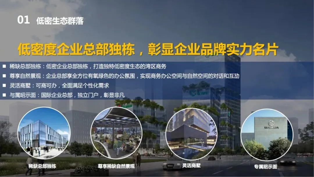 稀缺总部独栋:低密企业总部独栋,打造独特低密度生态的湾区商务;