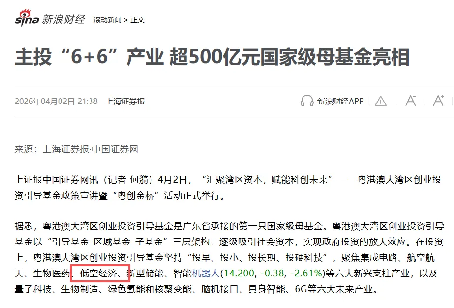 在资本层面,深圳持续加码。2026年3月,龙华区落地总规模超13亿元的产业基金与天使基金,其中新势能二期天使基金总规模3.15亿元,重点布局低空经济早期创新项目。2026年4月,粤港澳大湾区创业投资引导基金亮相,总规模超500亿元,低空经济位列六大新兴支柱产业之一。