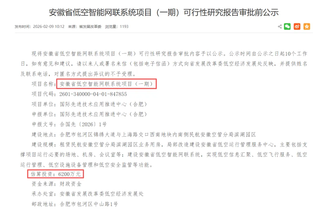 安徽省发展改革委安徽省低空智能网联系统项目(一期)可行性研究报告审批前公示