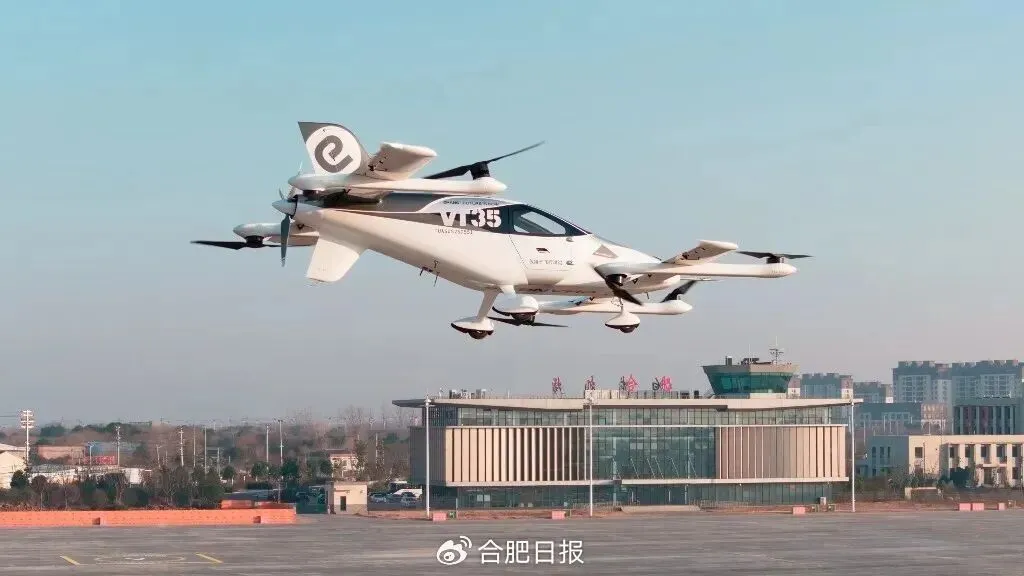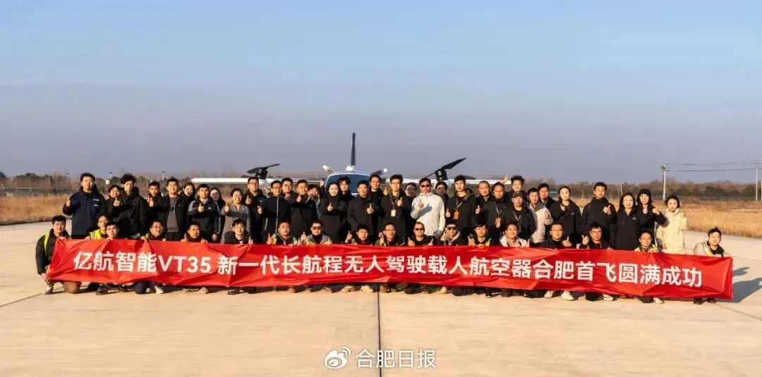 2025年8月,亿航智能与合肥政府正式签署投资合作协议,VT35系列新一代长航程复合翼eVTOL总部落户合肥。2025年12月28日,亿航智能VT35长航程无人驾驶eVTOL在合肥白龙机场成功完成首次公开飞行演示。VT35复合翼电动垂直起降航空器满载航程超200公里,主要面向跨城市、跨海域、跨山区等中长途交通出行场景。