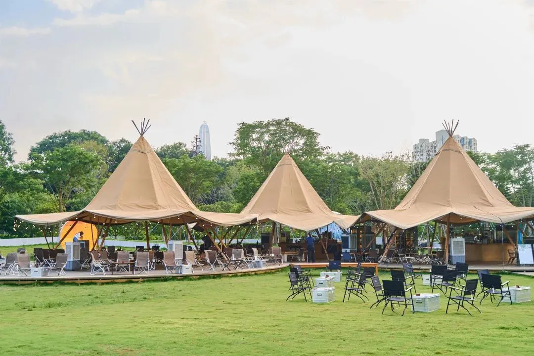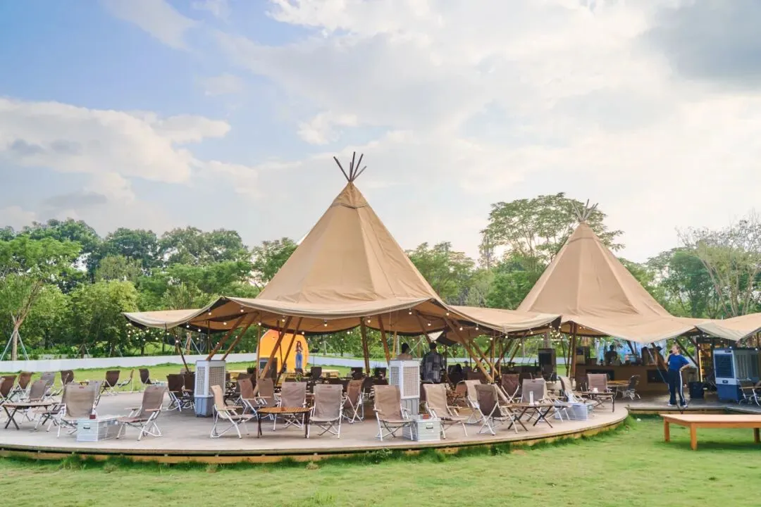 边吃边玩,是这里的一大乐趣。从秋日晴空下的营地野餐、围观飞盘到午后限定的草坪音乐会、欢唱KTV,游走在这里,不就是打工人想要的快乐吗?天色渐暗,天幕帐篷上的小灯饰便悄然亮起,点点星光照亮黑夜,坐在天幕下,与三五知己一起看着漫天星光的夜景,心情瞬间愉悦起来。