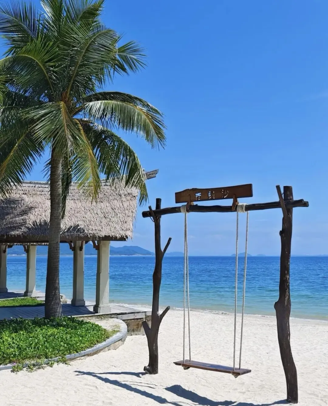 椰林秋千:往酒店方向走30米,就能看到那个被小红书博主刷爆的白色秋千。下午3-4点阳光斜照时,让朋友站秋千斜后方,用手机人像模式虚化背景,裙摆随风扬起的瞬间按下快门,秒变度假大片(记得穿浅色系衣服,和绿色椰林对比更出挑)。