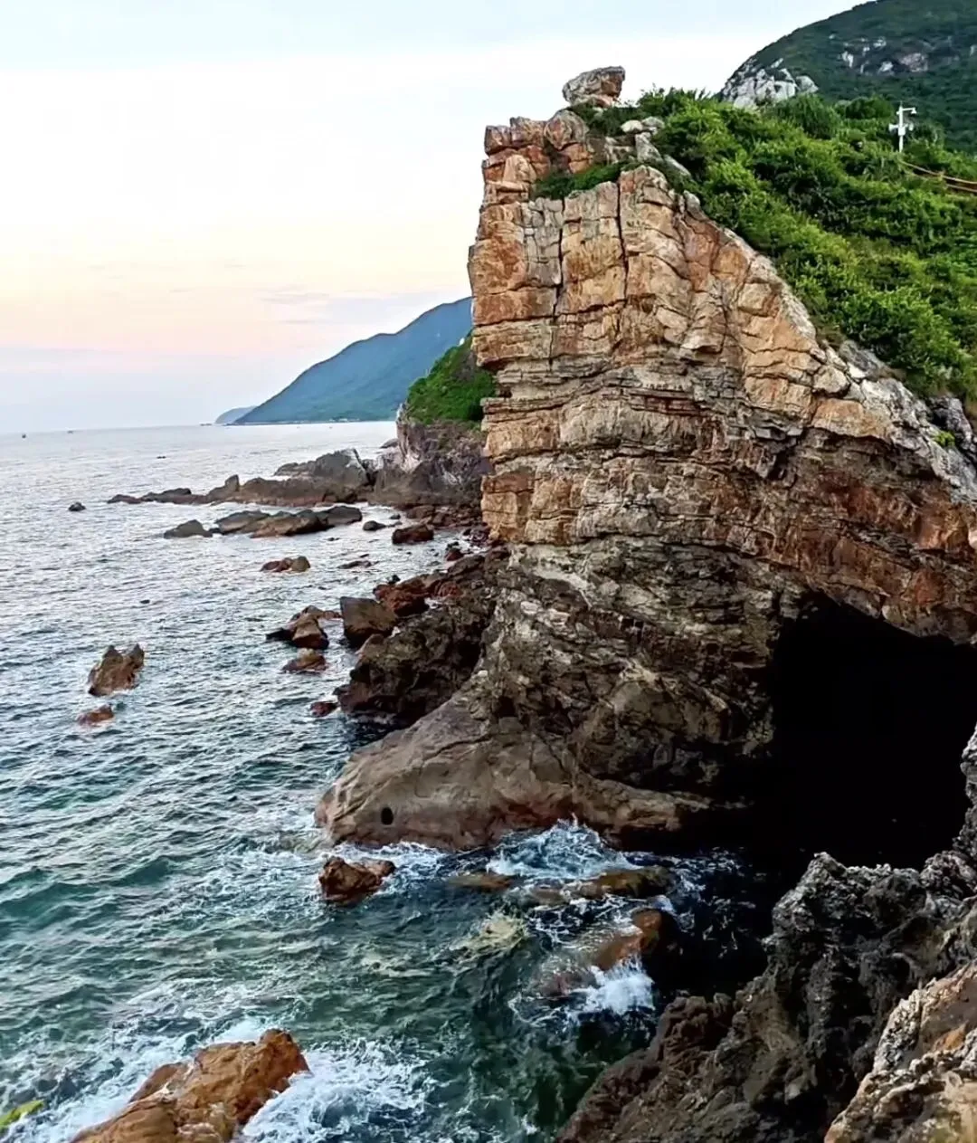 美人鱼洞观景台:顺着栈道再走5分钟,就能看到《美人鱼》里的标志性场景——美人鱼洞。洞口被海浪冲刷得呈心形,站在观景台台阶上俯拍,人物站在洞口正下方,用手机0.5倍广角,能把整个洞和海平面都拍进去(建议穿红色或白色衣服,和蓝色海面对比更强烈)。
