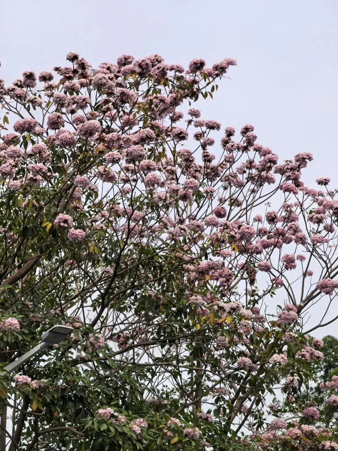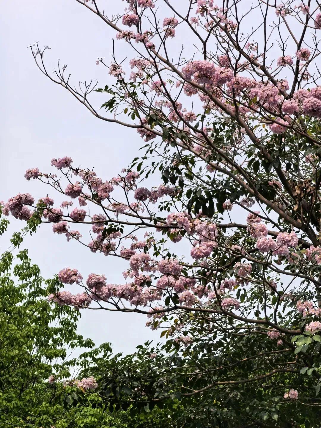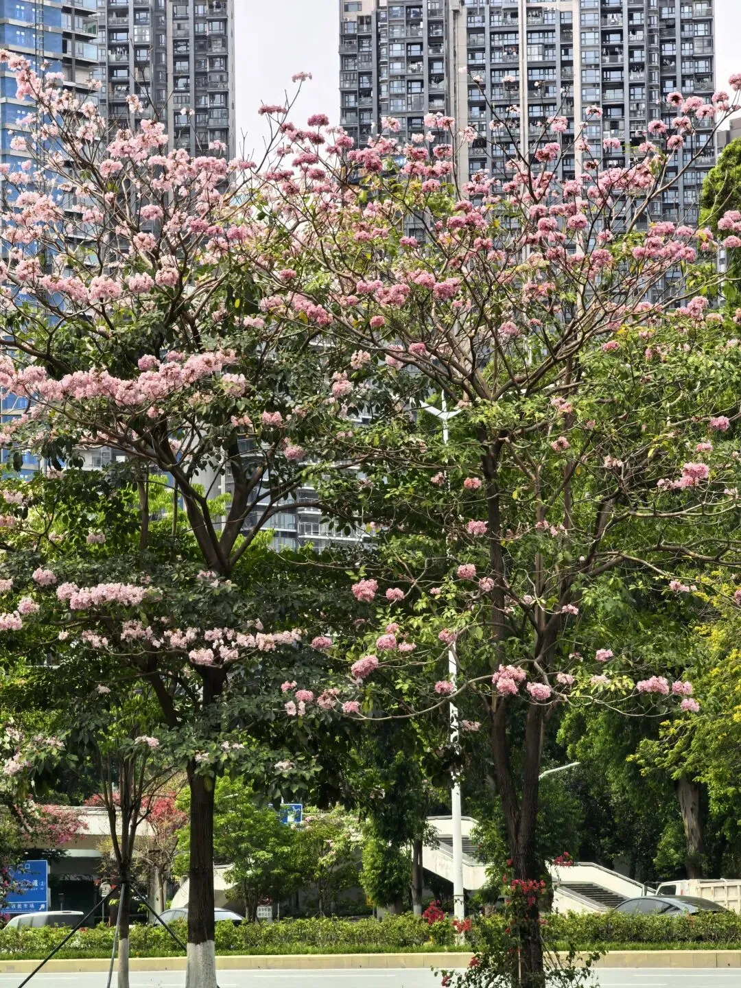 紫粉色的风铃木盛开在道路两边,花朵一簇一簇的,很是好看。