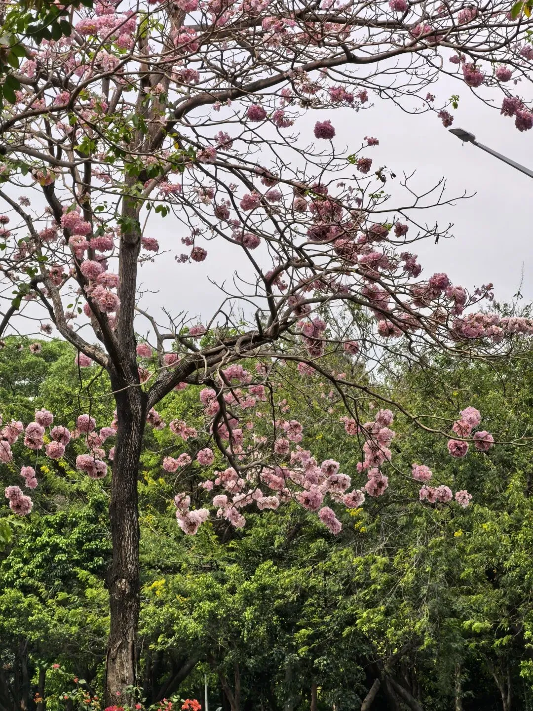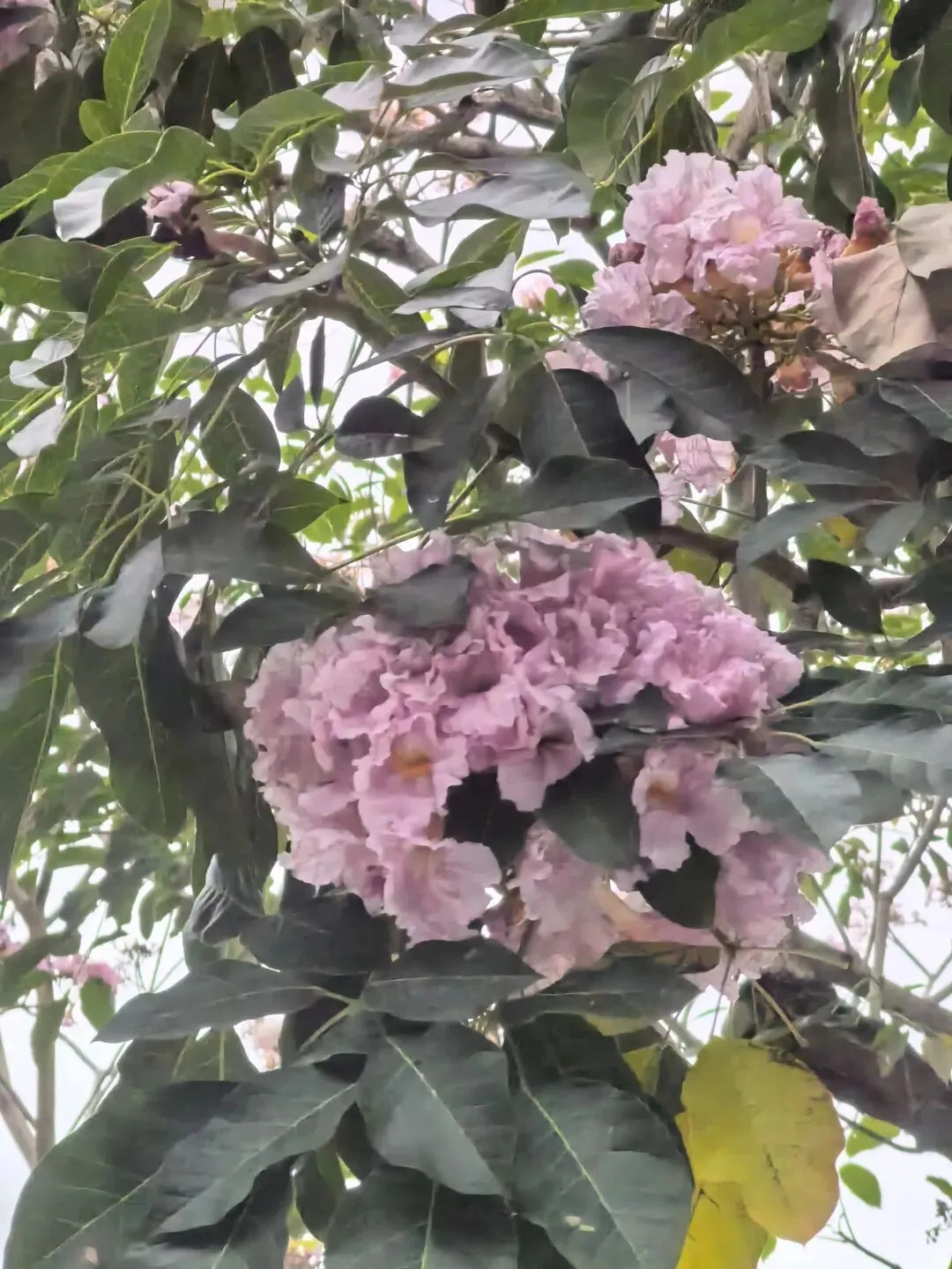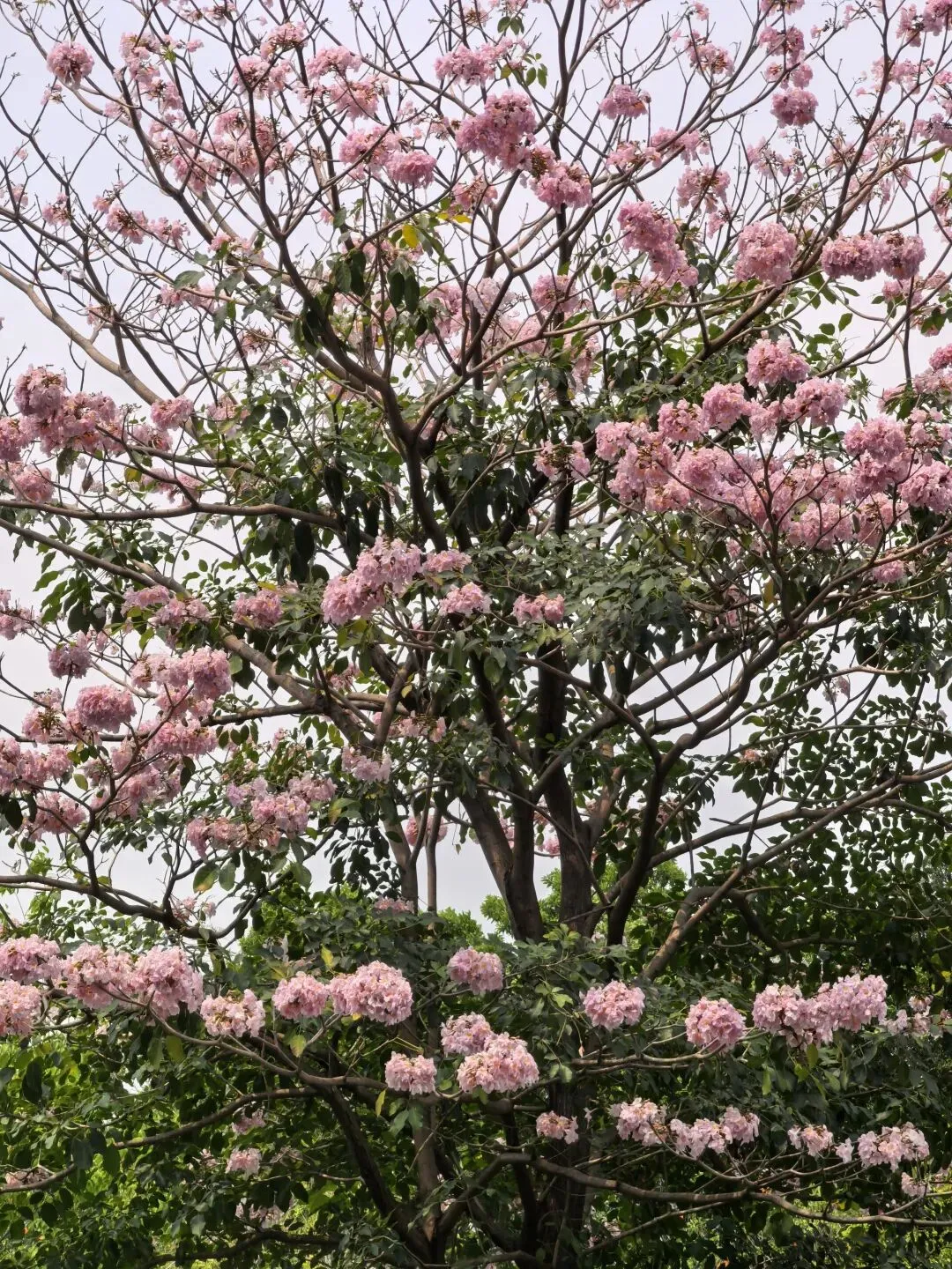 紫粉色的风铃木盛开在道路两边,花朵一簇一簇的,很是好看。