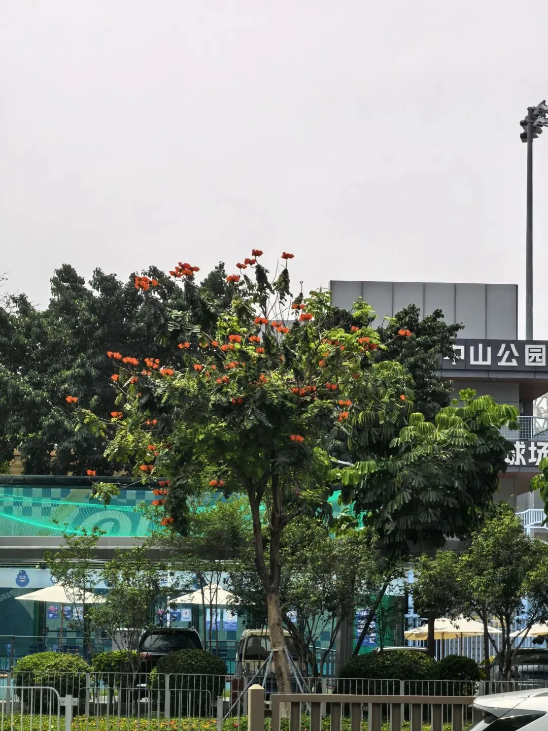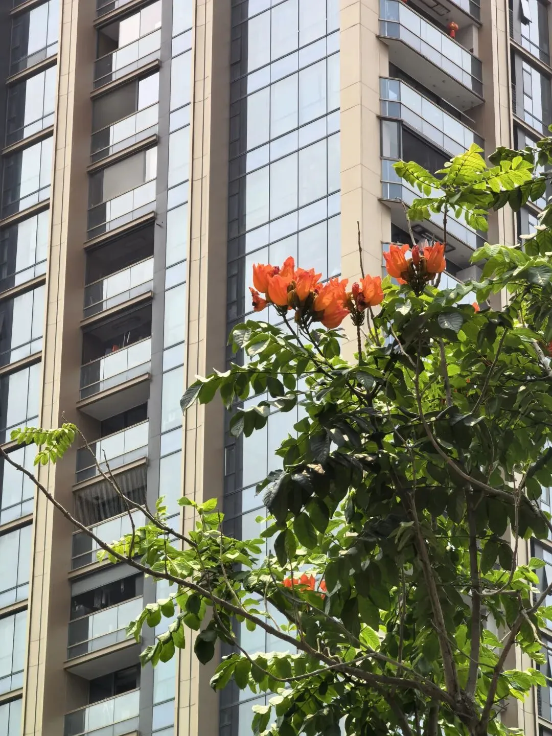 橙红色的火焰木花朵盛开在树冠上, 像燃放的火焰般醒目、热烈。