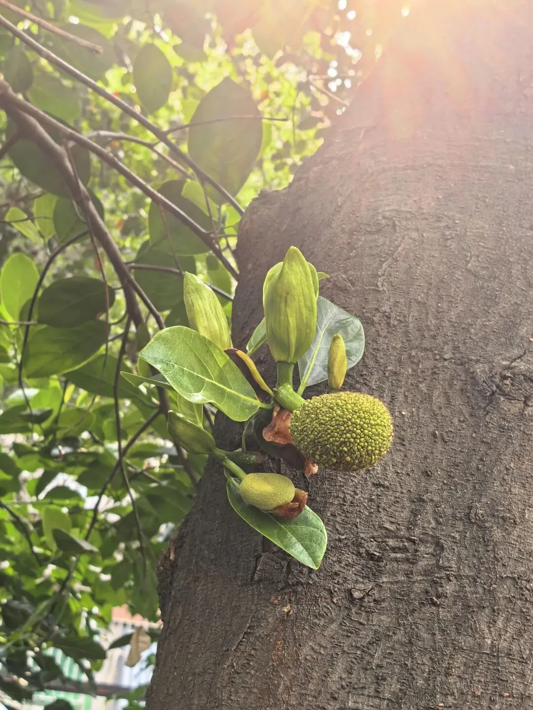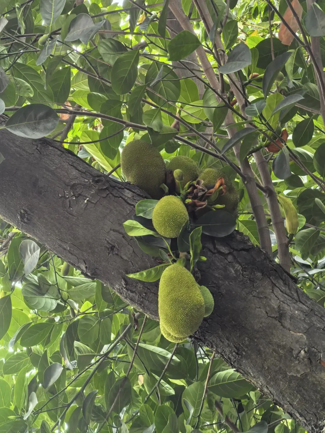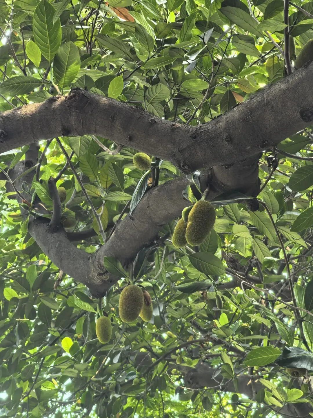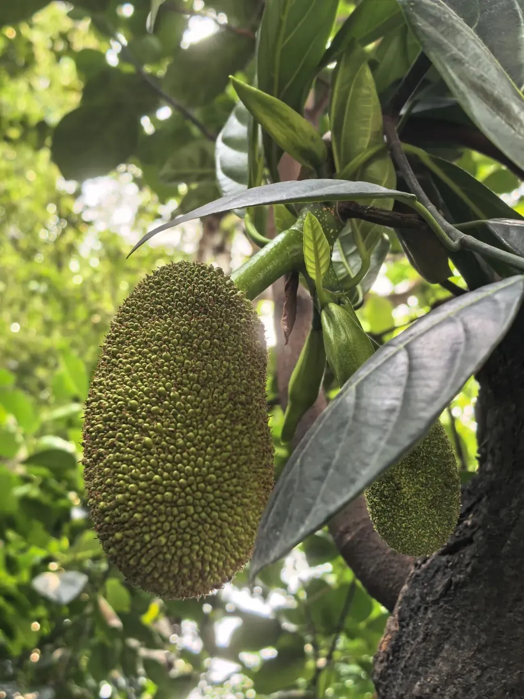 人行道旁菠萝蜜树上结满了果子,毛茸茸的特别可爱