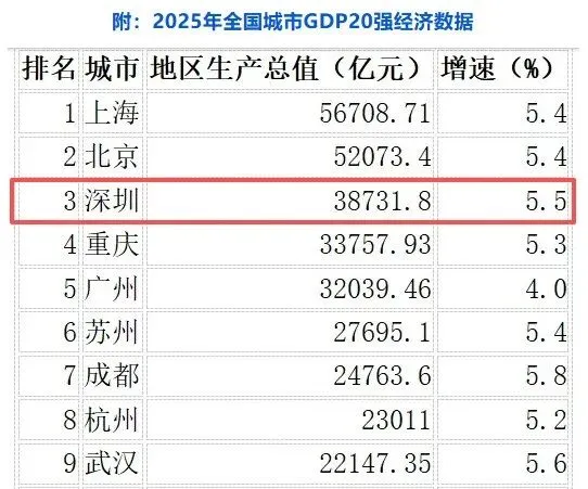 2025年,深圳经济持续保持稳健增长,GDP总量38731.8亿元,稳居全国城市第三,经济底盘稳固,为人口流入筑牢坚实支撑。