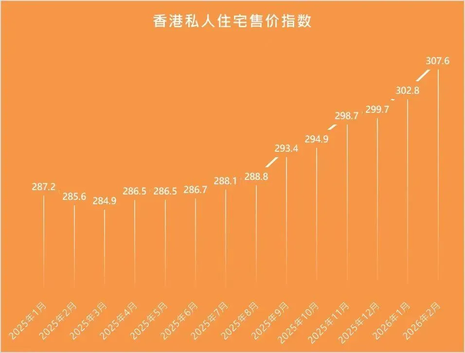 2026年3月27日,香港差饷物业估价署公布2026年2月私人住宅售价指数:307.6点,较2026年1月上涨1.5%。香港私人住宅售价指数自2025年3月见底(284.9点)以来,已经连续11个月上涨。毗邻香港、长期受其影响的深圳楼市也会被带动。
