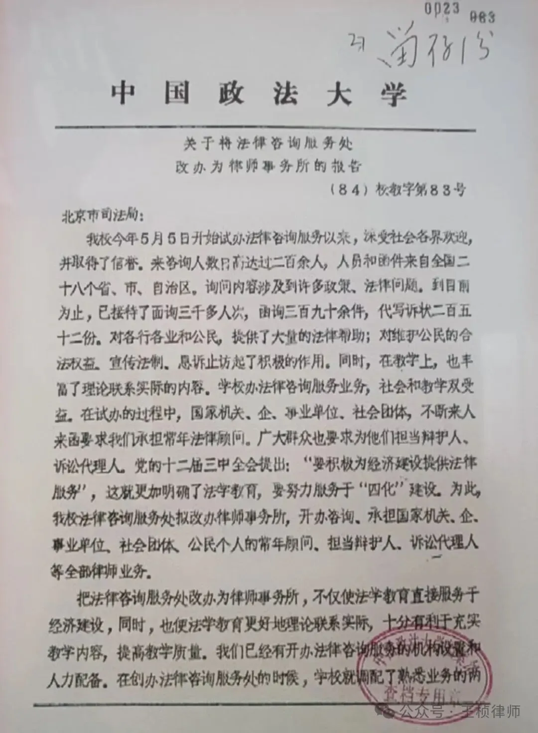 1984年,中国政法大学法律咨询服务处,改办为律师事务所