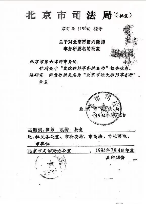 1994年,北京市第六律师事务所更名为北京市法大律师事务所。