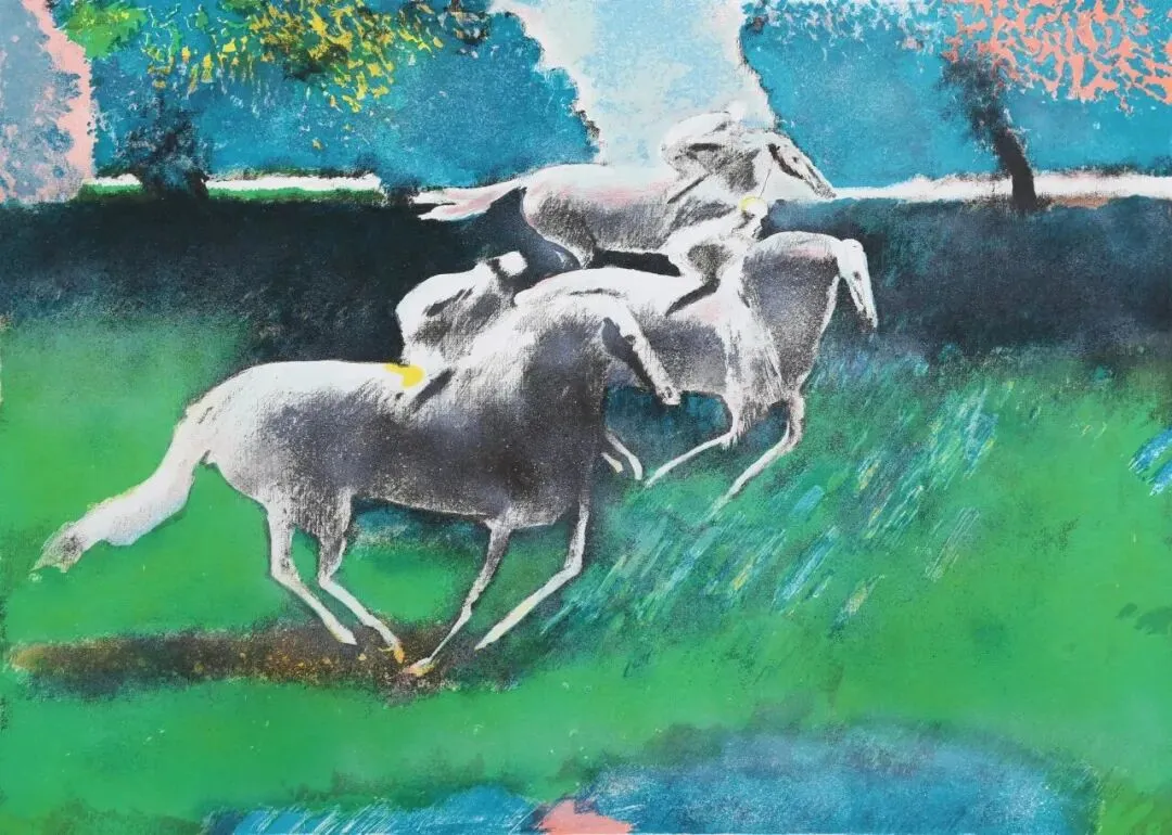 法国艺术家安德烈·布拉吉利以独创的色彩体系与流畅线条,将马的优雅与自由藏进梦幻光影;保罗·伽曼则以精炼线条与流动色彩,在“真实的非现实”中赋予马轻盈的诗性气质。意大利艺术家马里奥·马里尼将马与骑手主题贯穿创作生涯,以版画肌理呈现马的厚重与现代主义美感。