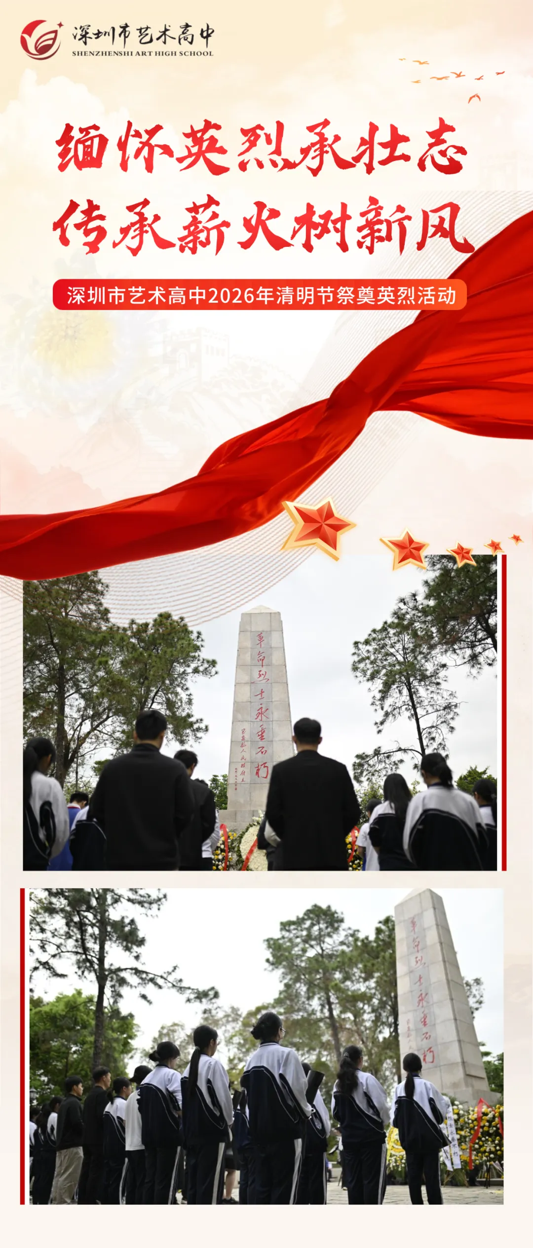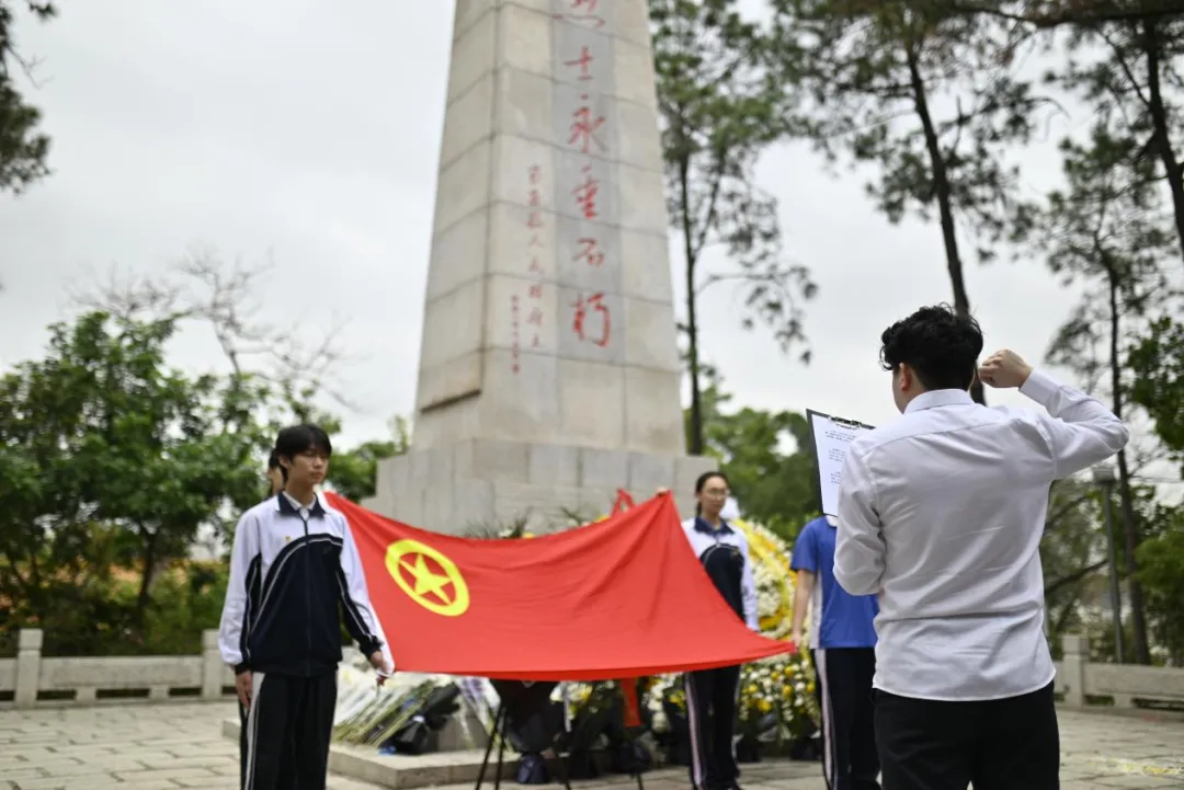 清明追思,致敬英烈;赓续血脉,践行初心。为深切缅怀革命先烈,传承红色基因,厚植爱国情怀,近日,深圳市艺术高中组织党员代表、学生团员代表、少先队员代表前往龙华革命烈士纪念碑,举行2026年“缅怀英烈承壮志·传承薪火树新风”清明祭奠革命烈士活动,以最庄重的仪式,向革命先烈致以最崇高的敬意与最真挚的感恩之情。本次活动由团委副书记叶妙玲主持。